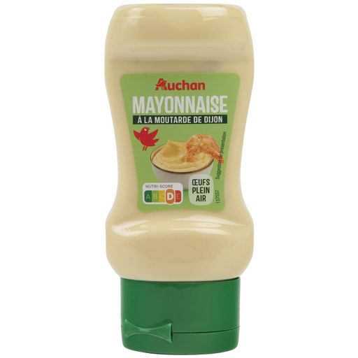 Mayonnaise Auchan à la moutarde de Dijon en format squeeze pratique à utiliser autant par les petits que par les grands.