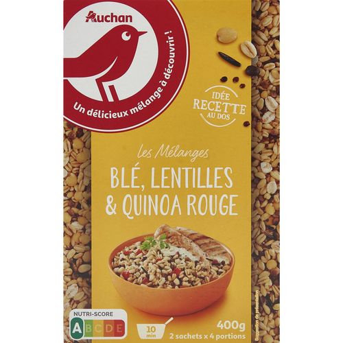 Ingrédients : BLÉ précuit 65%, lentilles précuites 20% (lentilles vertes précuites, lentilles blondes précuites), quinoa rouge 5%, riz sauvage 5%, flocons d'ORGE 5%. Traces éventuelles de soja, de moutarde, de graines de sésame et d'autres céréales contenant du gluten.