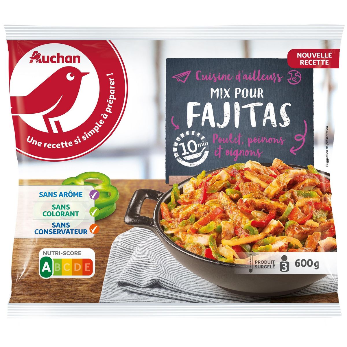 Ingrédients : filet de poulet traité en salaison 28% (viande de poulet (origine Thaïlande), eau, dextrose, amidon, sel), tomate pelée concassée 16% (tomate, acidifiant : acide ascorbique), poivron jaune 12%, poivron rouge 12%, poivron vert 12%, oignon rouge 9,1%, oignon, eau, huile de tournesol et/ou colza, purée de tomate double concentrée 0,8%, ail, piment rouge jalapeños, coriandre, paprika fumée, sel, farine de riz, cumin, poivre blanc.