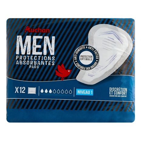 Protections absorbantes Hommes Niveau 1Discrétion et confortTriple protection : contrôle des odeurs, protection anti-fuites, protection contre l'humiditéVoile de surface ultra doux testé dermatologiquement Coeur absorbantForme anatomique