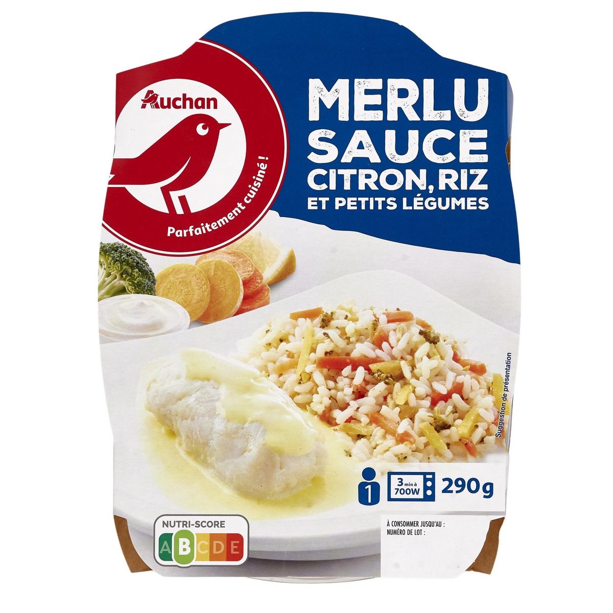 Ingrédients : Riz cuit (eau, riz blanc) 29,3%, filet de merlu (POISSON) 25,5%, eau, carottes 13,1%, crème fraîche (LAIT origine France) 5%, brocolis 2,4%, farine de BLÉ, beurre (LAIT origine UE, non UE), huile de colza, échalotes, zeste de citron jaune 0,9%, jus concentré de citron 0,8%, sel, arôme naturel citron vert avec autres arômes naturels, amidon modifié de maïs, sucre, épice curcuma. Pourcentages exprimés sur le total de la recette.