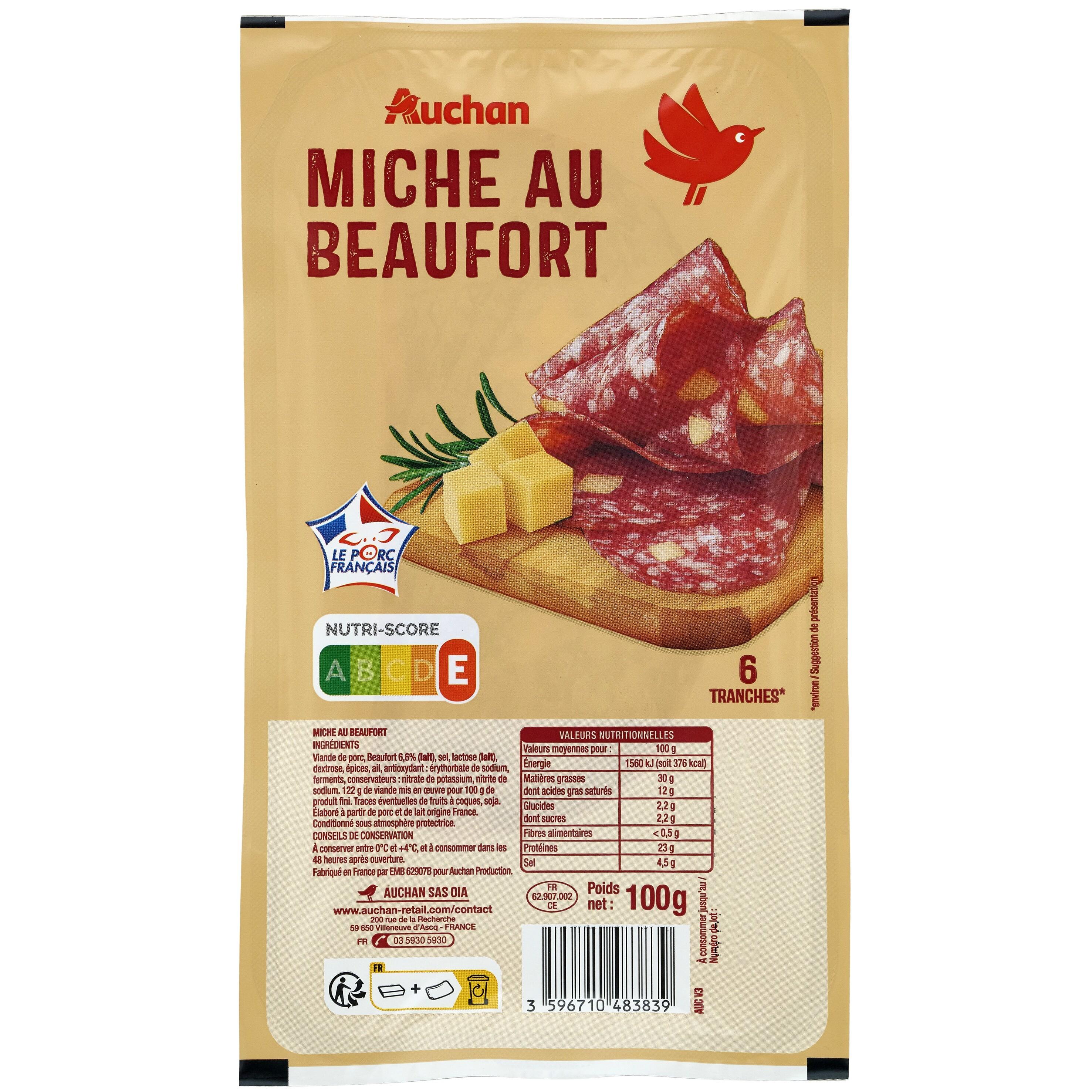 Ingrédients : Viande de porc, beaufort 6,6% (LAIT), sel, lactose (LAIT), dextrose, épices, ail, antioxydant: érythorbate de sodium, ferments, conservateurs : nitrate de potassium, nitrite de sodium. 122g de viande mis en œuvre pour 100g de produit fini. Traces éventuelles de fruits à coques, soja. Elaboré à partir de porc et de lait origine France.