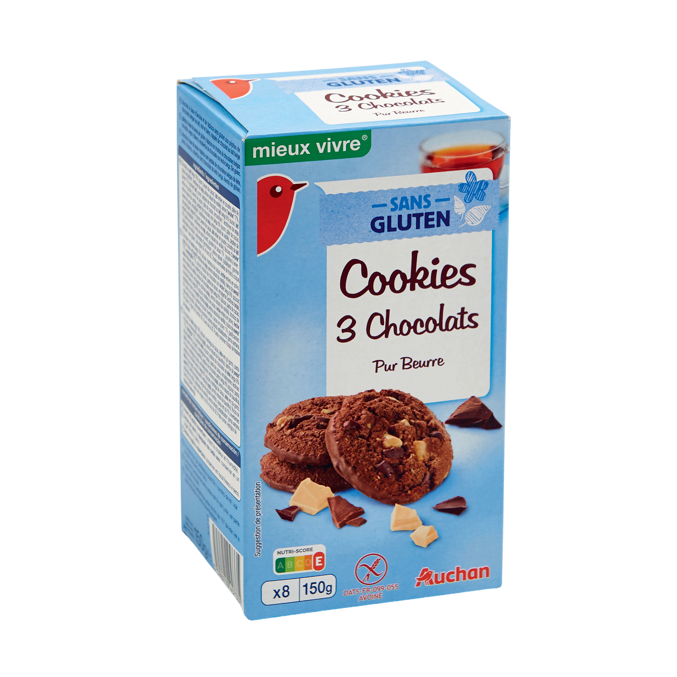 Biscuits à base d'avoine et de tapioca sans gluten aux pépites de chocolats belges au lait, noir et blanc, nappés de chocolat au lait belge