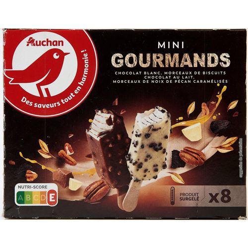 Ingrédients : Mini bâtonnet cookies : LAIT écrémé réhydraté, sucre, beurre de cacao 11,52%, graisses végétales (noix de coco, tournesol), sirop de glucose, eau, lactosérum en poudre (LAIT), matière grasse laitière anhydre (LAIT), LAIT écrémé, lactose (LAIT) et protéines de LAIT, fructose, amidon de pomme de terre, dextrose, cacao maigre en poudre 0,7%, LAIT condensé entier (LAIT, sucre, lactose (LAIT)), farine de riz, beurre (LAIT), amidon modifié de maïs émulsifiants: mono- et diglycérides d'acides gras, lécithine de SOJA stabilisants: farine de graines de caroube, gomme guar, carraghénanes chocolat 0,15% (sucre, beurre de cacao, cacao) épaississants: pectines, gomme xanthane arômes naturels, sel, arôme naturel de vanille, poudre à lever: carbonate acide d'ammonium, correcteur d'acidité: carbonate de potassium. Traces éventuelles d’œufs et de fruits à coque. Mini bâtonnet pécan : LAIT écrémé réhydraté, sucre, beurre de cacao 9,31%, eau, graisse végétale de noix de coco , NOIX PÉCAN 3,68%, sirop de glucose, caramel beurre salé 2,64% (sucre, LAIT condensé sucré (LAIT, sucre, lactose (LAIT)), beurre salé (LAIT)), pâte de cacao 2,56%, matière grasse laitière anhydre (LAIT), LAIT écrémé en poudre, lactose (LAIT) et protéines de LAIT, lactosérum en poudre (LAIT), fructose émulsifiants: mono- et diglycérides d'acides gras, lécithine de SOJA, polyricinoléate de polygrlycérol stabilisants: farine de graines de caroube, gomme guar, carraghénanes amïdon modifié de maïs, dextrose, arôme naturel de vanille, arômes naturels, caramel (sucre, eau), sirop de sucre caramélisé, acidifiant: acide lactique, épaississant: gomme xanthane, gousses de vanille, colorant: caroténoïdes. Traces éventuelles d'oeufs et d'autres fruits à coque. Pourcentages exprimés sur chaque bâtonnet.