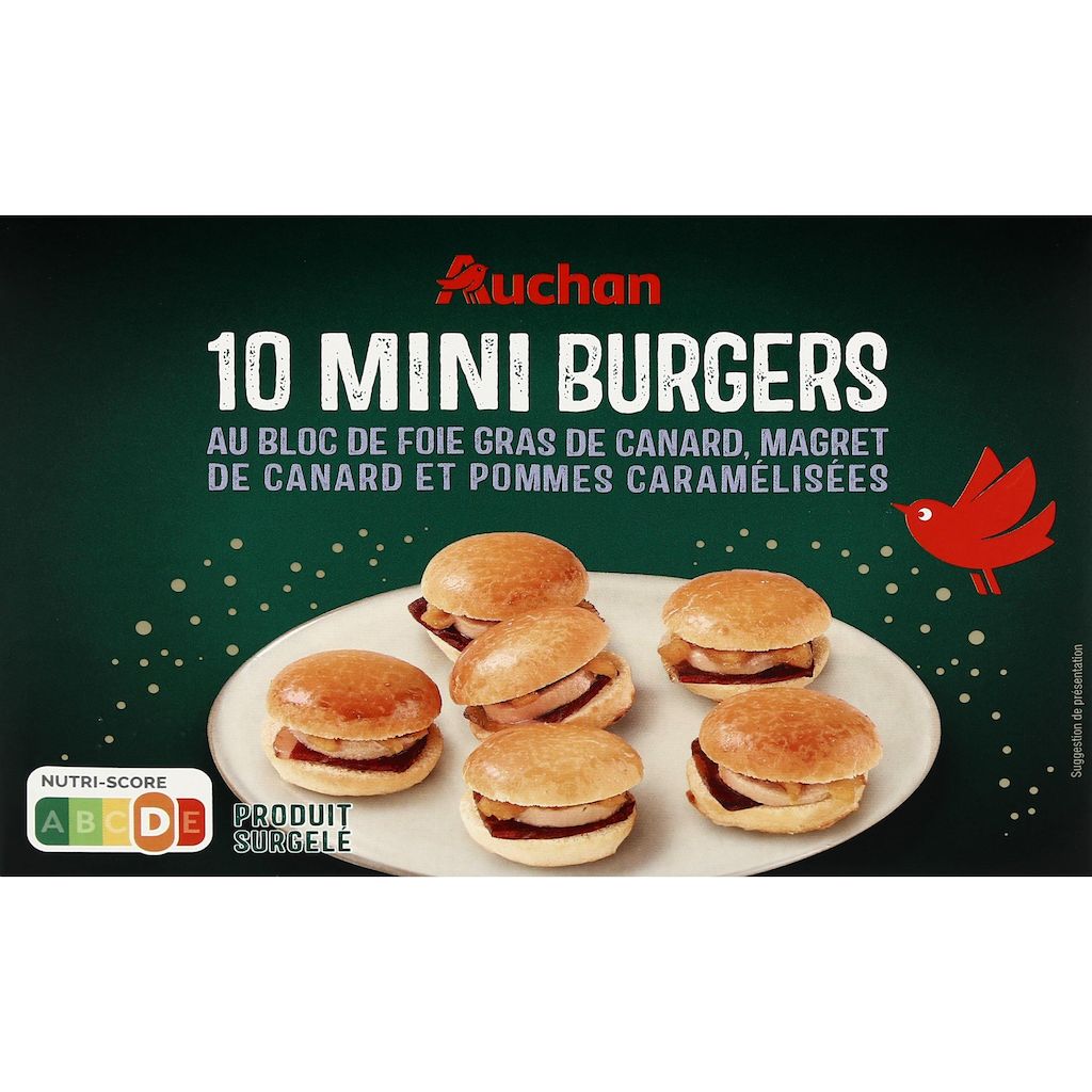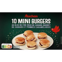10 mini pains spéciaux garnis de magret de canard fumé au bois de hêtre, bloc de foie gras de canard et préparation cuite de pomme au caramel, surgelés.