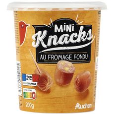 Des Minis Knacks (spécialités de pâtes fines) de Porc FRANCAIS, aromatisées au fromage, idéales pour l'apéritif, dans un pot 100%microondable