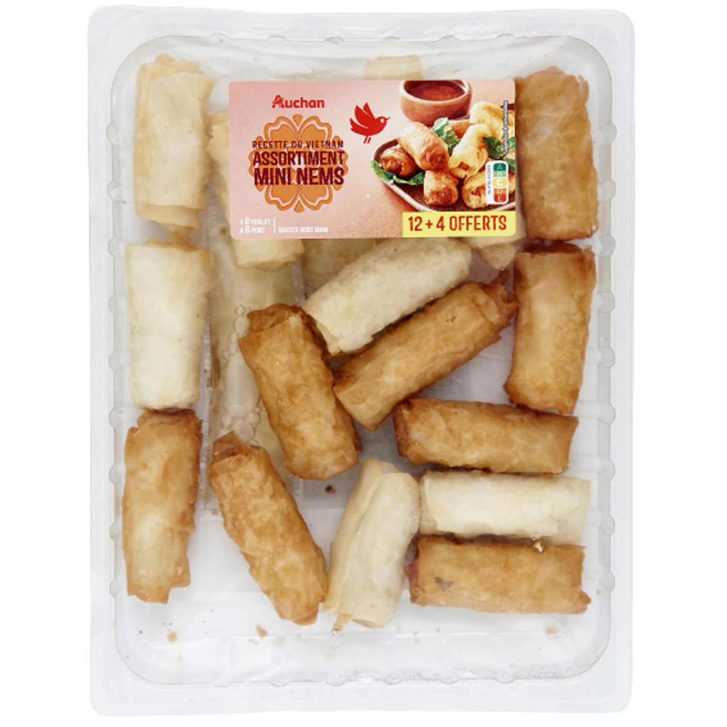Ingrédients : Mini nems au porc (44,5%) : Galette de riz 50% (eau, farine de riz, huile de tournesol, sel, caramel (sucre, eau)), viande de porc 5,7% (origine France), vermicelle de pois réhydraté, oignon, carotte 2,7%, protéine de soja texturée, germe de haricot mungo, gras de porc 1%, sauce soja (eau, graines de soja, farine de blé, sel), champignon noir réhydraté 0,7%, oignon déshydraté, sel, poivre.Mini nems au poulet et au curry (44.5%) : Galette de riz 50% (eau, farine de riz, huile de tournesol, sel), oignon, vermicelle de pois réhydraté, viande de poulet 4.7% (origine France), carotte, protéine de soja texturée, ail, arôme naturel, champignon noir réhydraté, amidon de maïs, sel, curry 0.1% (contient moutarde), sucre, poivre.Sauce nuoc mam (11%) : eau, sucre, nuoc mam 1.5% (poisson, sel, eau), vinaigre d'alcool, sel. Pourcentages exprimés sur le total de la recette. Traces éventuelles d'oeuf et de crustacés.