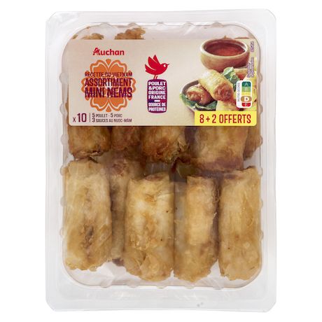 5 mini nems de porc et 5 mini nems de volaille avec 1 sachet de sauce à réchauffer au four et à partager à l'apéro