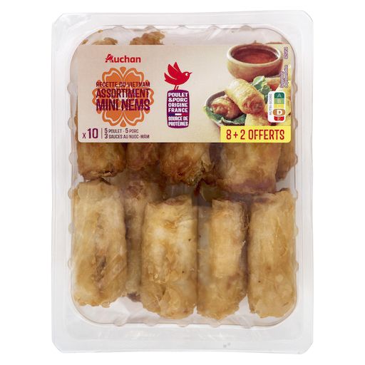 Ingrédients : Mini nems au porc 41.7% : galette de riz 17.4% [eau, farine de riz, huile de tournesol, caramel (sucre, eau), sel], vermicelle de pois réhydraté, oignon, carotte, viande de porc 3.7% (origine France), protéine de soja texturée, eau, gras de porc 0.6%, mix aromatique [sel, vinaigre de malt en poudre, maltodextrine de blé, épices (ail déshydraté, gingembre, cannelle, poivre noir, piment, curcuma), plantes aromatiques (coriandre, oignon en poudre), arômes], champignon noir réhydraté, amidon de maïs, sel. Mini nems au poulet 41.7% : galette de riz 17.4% (eau, farine de riz, huile de tournesol, sel), viande de poulet 6.6% (origine France), vermicelle de pois réhydraté, oignon, carotte, protéine de soja texturée, champignon noir réhydraté, sauce soja (eau, graines de soja, farine de blé, sel), fécule de manioc, sel, poivre blanc.Sauce nuoc-mâm 16.6% : eau, sucre, nuoc-mâm 2.3% (poisson, sel, eau), vinaigre d'alcool, sel. Pourcentages exprimés sur le total de la recette. Traces éventuelles d'oeuf et de crustacés.
