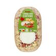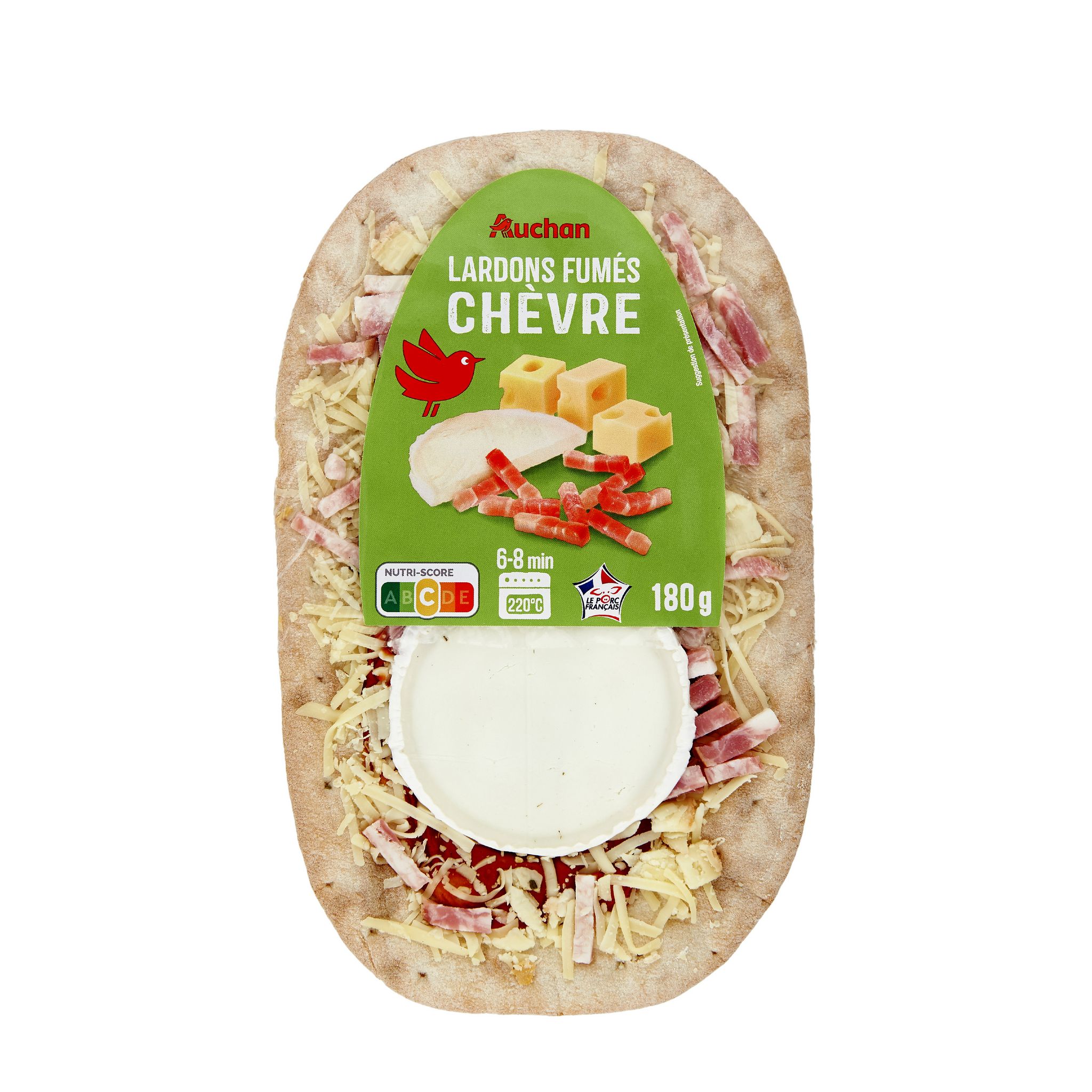 Ingrédients : Sauce tomate cuisinée 33,3% (eau, purée de tomates double concentrée 8,4%, farine de BLÉ, huile d'olive vierge extra), pâte cuite 33,2% (farine de BLÉ, eau, levure, sel, sucre), lardons cuits fumés* 11,1% (poitrine de porc, sel, dextrose, antioxydant : érythorbate de sodium, conservateur : nitrite de sodium), emmental (LAIT) 8,3%, fromage de chèvre* (LAIT) 8,3%, fromage à raclette (LAIT) 5,5% (conservateur : natamycine), origan déshydraté 0,05%, basilic déshydraté 0,05%. *Ingrédients décongelés, ne pas recongeler. Pourcentages exprimés sur le total de la recette. Elaboré à partir de porc origine France et de lait origine UE.