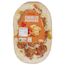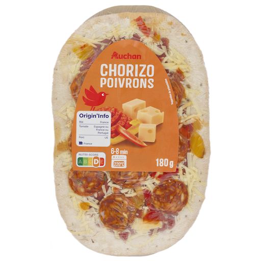 Ingrédients : Sauce tomate cuisinée 33,3% (eau, purée de tomates double concentrée 8,5%, farine de BLÉ, huile d'olive vierge extra), pâte cuite 31,1% (farine de BLÉ, eau, levure, sel, sucre), chorizo* 18,7% (viande de porc, gras de porc, piments, sel, ail, origan, muscade, ferments), emmental (LAIT) 11,1%, poivrons rouges et verts* 5,6%, basilic déshydraté 0,05%, origan déshydraté 0,05%.*Ingrédients décongelés, ne pas recongeler.Pourcentages exprimés sur le total de la recette.Elaboré à partir de porc et de lait origine UE.