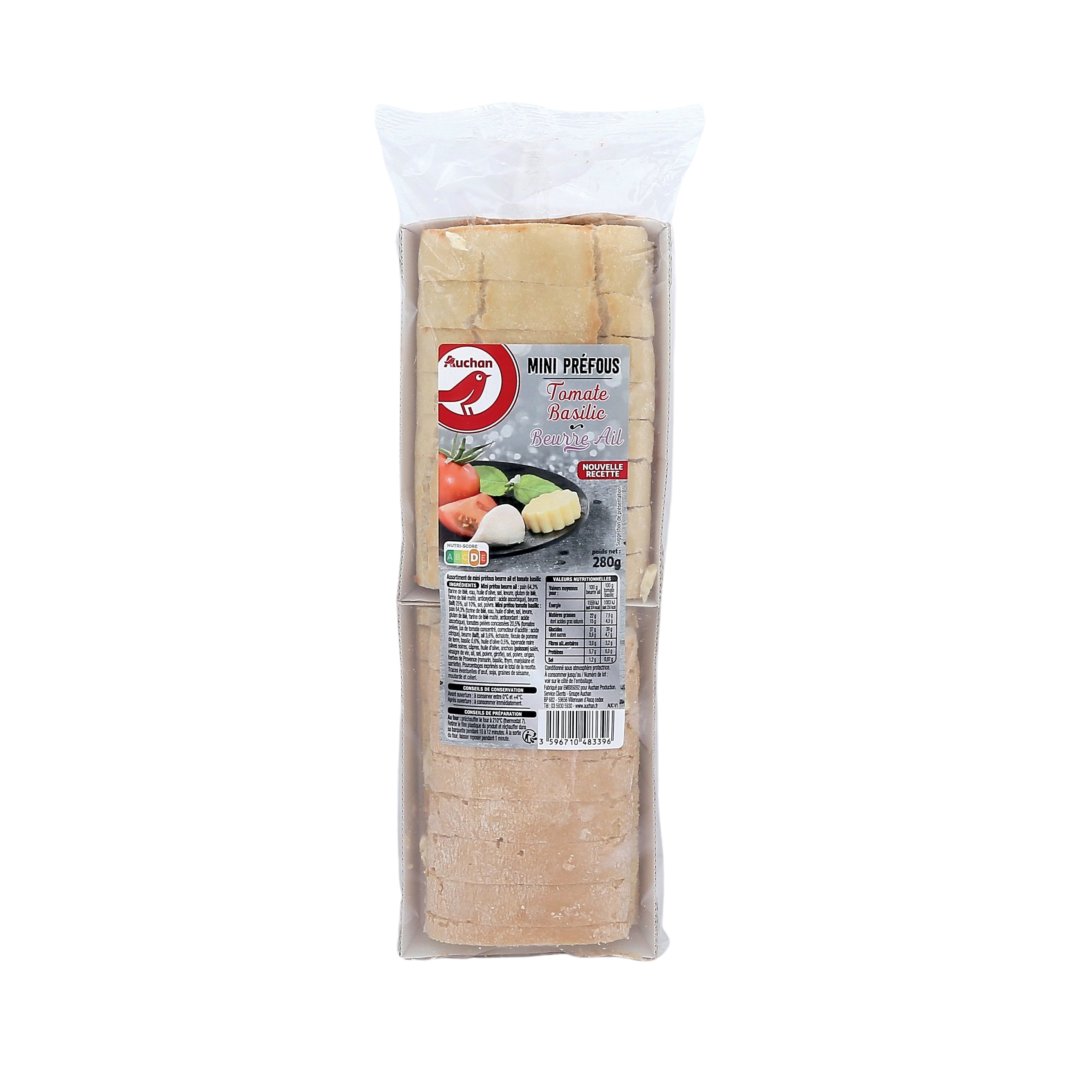 Ingrédients : MINI PRÉFOU BEURRE AIL : pain 64,3% (farine de BLÉ, eau, huile d'olive, sel, levure, gluten de BLÉ, antioxydant : acide ascorbique), beurre (LAIT) 25%, ail 10%, sel, poivre. MINI PRÉFOU TOMATE BASILIC : pain64,3% (farinede BLÉ , eau, huile d'olive, sel,levure, gluten de BLÉ , antioxydant : acide ascorbique), tomates entières pelées 20,5%(tomates pelées, jus de tomate, sel), beurre (LAIT) 7,9% , ail 3,2%,échalote, fécule de pomme de terre, basilic 0,6%, huile d'olive 0,6%, sel,poivre, origan, herbes de Provence (romarin, basilic, thym, marjolaine etsarriette). Pourcentages exprimés sur le total de la recette. Elaboré à partir de lait et d'ail origine France. Traces éventuelles d'oeuf, soja, graines de sésame, moutarde et céleri.
