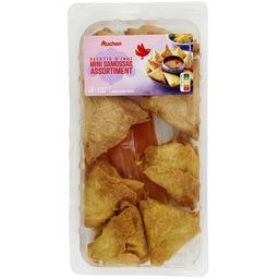 Ingrédients : Mini samossas au poulet frits (41,7%) : Galette de blé 36.8% (eau, farine de blé, huile de tournesol, blanc d'oeuf en poudre, sel, curcuma, émulsifiant : lécithine de colza), oignon, viande de poulet 7.1%, carotte, courgette, protéine de soja texturée, poivron rouge, eau, coriandre, huile de tournesol, ail, sel, amidon de maïs, arôme naturel, sucre, gingembre, piment fort, poivre blanc. Mini samossas au bœuf frits (41,7%) : Galette de blé 37% (eau, farine de blé, huile de tournesol, blanc d'oeuf en poudre, sel, émulsifiant : lécithine de colza), oignon, viande bovine 5.3%, vermicelle de pois réhydraté, protéine de soja texturée, eau, huile de tournesol, sauce soja (eau, graines de soja, farine de blé, sel), sucre, curry (contient moutarde), amidon de maïs, sel, curcuma.Sauce aigre douce (16,6%) : Eau, sucre, vinaigre d’alcool, ananas, poivron rouge, amidon modifié de maïs, huile de tournesol, sel, acidifiant : acide citrique, épices et plantes aromatiques (curry, gingembre) stabilisants : gomme guar, gomme xanthane. Pourcentages exprimés sur le total de la recette. Traces éventuelles de crustacés, poisson, lait et fruits à coque.Elaboré à partir de poulet et bœuf origine France.