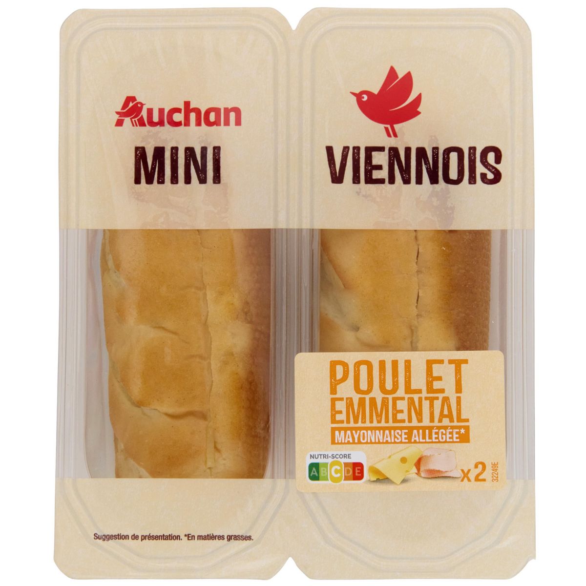 Sandwich au pain spécial viennois garni de poulet cuit standard reconstitué, d'emmental et de mayonnaise allégée en matière grasses*.