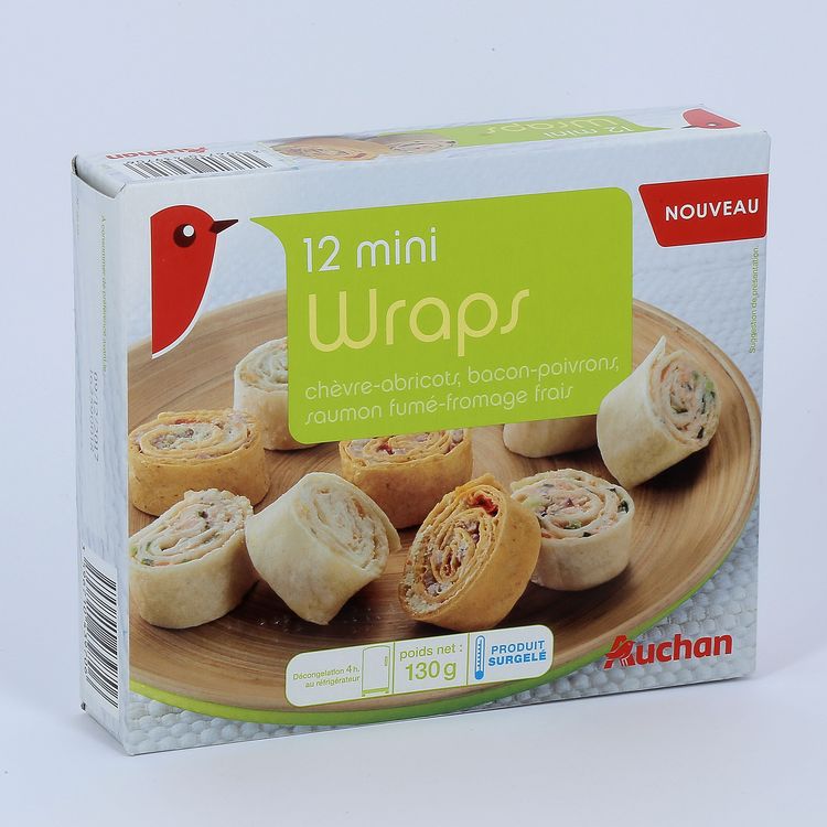 4 mini wrap au fromage de chèvre et aux abricots : Galette de blé (farine de blé (contient gluten ), eau, huile de colza ; poudres à lever : carbonates de sodium, diphosphates de potassium ; dextrose, acidifiant : acide malique, sel), fromage de chèvre (contient lait origine UE) 9,5%, fromage frais (contient lait origine France), abricots secs 1,6% (abricots, farine de riz, conservateur : dioxyde de soufre (contient sulfites )) 4 mini wrap au bacon, tartare de poivron et moutarde au miel : Galette de blé tomate (farine de blé (contient gluten ), eau, huile de colza ; poudres à lever : carbonates de sodium, diphosphates de potassium ; tomates 0,13%, dextrose, sel, acidifiant : acide malique, herbes et épices, paprika, légumes déshydratés (oignon, ail)), fromage frais (fromage frais (contient lait origine France), sel), bacon cuit fumé 4,1% (viande de porc (origine UE), sel, dextrose, arôme de fumée, acidifiant: acide citrique, antioxydant: érythorbate de sodium, conservateur: nitrite de sodium), tartare de poivrons rouges grillés 1,8% (poivrons cubes grillés, huile de colza, vinaigre de xérès, ail, sucre, sel, plantes aromatiques), moutarde mi-forte au miel de châtaigne 1,3% (eau, graines de moutarde , vinaigre, miel de châtaigne 0,13%, sel, épice, arômes, conservateur : bisulfite de sodium (contient sulfites )), farine de blé (contient gluten ), fibre de blé (contient gluten ). 4 mini wrap au fromage frais et au saumon : Galette de blé (farine de blé (contient gluten ), eau, huile de colza ; poudres à lever : carbonates de sodium, diphosphates de potassium ; dextrose, acidifiant : acide malique, sel), fromage frais (fromage frais (contient lait origine France), sel) 10,9%, saumon fumé (saumon atlantique (Salmo salar) ( poisson ) fumé au bois de hêtre, sel) 5%, huile de colza, jus de citron (jus de fruits à base de concentrés de citron et d’orange, eau, pulpe de citron, acidifiant : acide citrique, extrait naturel de citron), lait demi-écrémé (origine France), sucre, aneth. Pourcentages exprimés sur le total de la recette.