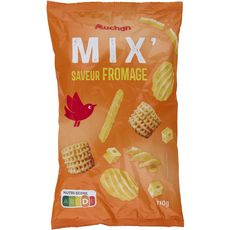 Ingrédients : Frites : Pomme de terre déshydratée 42%, semoule de maïs 42%, huile de colza, dextrose, poudre de petit-LAIT, sel, arômenaturel (contient LAIT), poudre de babeurre (LAIT), oignon, poudres de fromages (LAIT) 0.08%. Quadritos : Farine de maïs 44%, huile de tournesol, amidon de BLÉ, arôme naturel (LAIT),sucre, sel, poudre à lever : carbonates de sodium, poudres de fromages (LAIT) 0.6% Vrilles :Pomme de terre déshydratée 44%, amidon de pomme de terre 38%, huile de tournesol, arômenaturel (contient LAIT), sel, poudre de fromage (LAIT) 0.19%, paprika et curcuma déshydratés. Pétales : Pomme de terre déshydratée 44%, huile de tournesol, amidon de pomme de terre 22%, arôme naturel (contient LAIT), sel,paprika et curcuma déshydratés, poudre de fromage (LAIT) 0.28%. Pourcentages exprimés sur le total de chaque recette. Traceséventuelles d'arachide et de crustacés. Elaboré à partir de maïs origine France et de pommes de terre origine UE.
