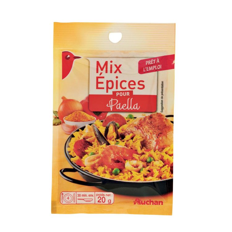 :RECETTE POUR 4 PERSONNES * 1 sachet mélange pour paëlla * 500 g de morceaux de poulet * 8 gambas * 250 g de riz * 50 cl d'eau * 2 cuillères à soupe d'huile Dans une poêle à paëlla ou une sauteuse, faire revenir le poulet et les gambas dans l’huile . Ajouter le riz et laisser chauffer 2-3 min. Ajouter le contenu du sachet, l’eau et saler à votre convenance. Faire cuire à feu moyen pendant 15-20 min jusqu’ à complète évaporation de l’eau. Laisser reposer 1-2 min avant de servir. Pour une paëlla plus gourmande, vous pouvez l'agrémenter de petits pois, de moules, de calamars ou de rondelles de chorizo.