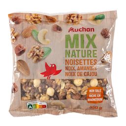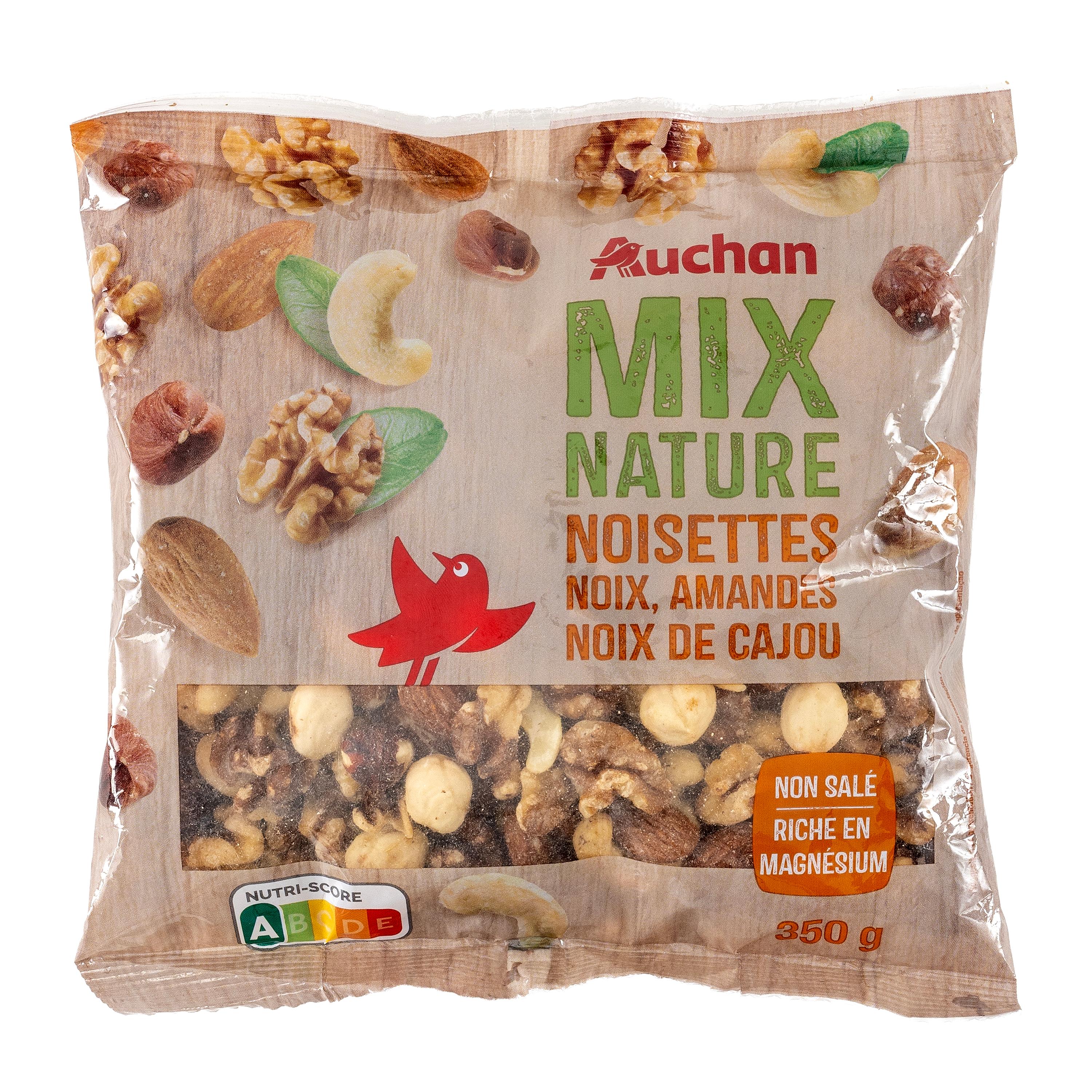 NOISETTES 25%, AMANDES 25%, NOIX 25%, NOIX DE CAJOU 25%. Traces éventuelles d'ARACHIDES et d’autres FRUITS À COQUE.