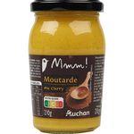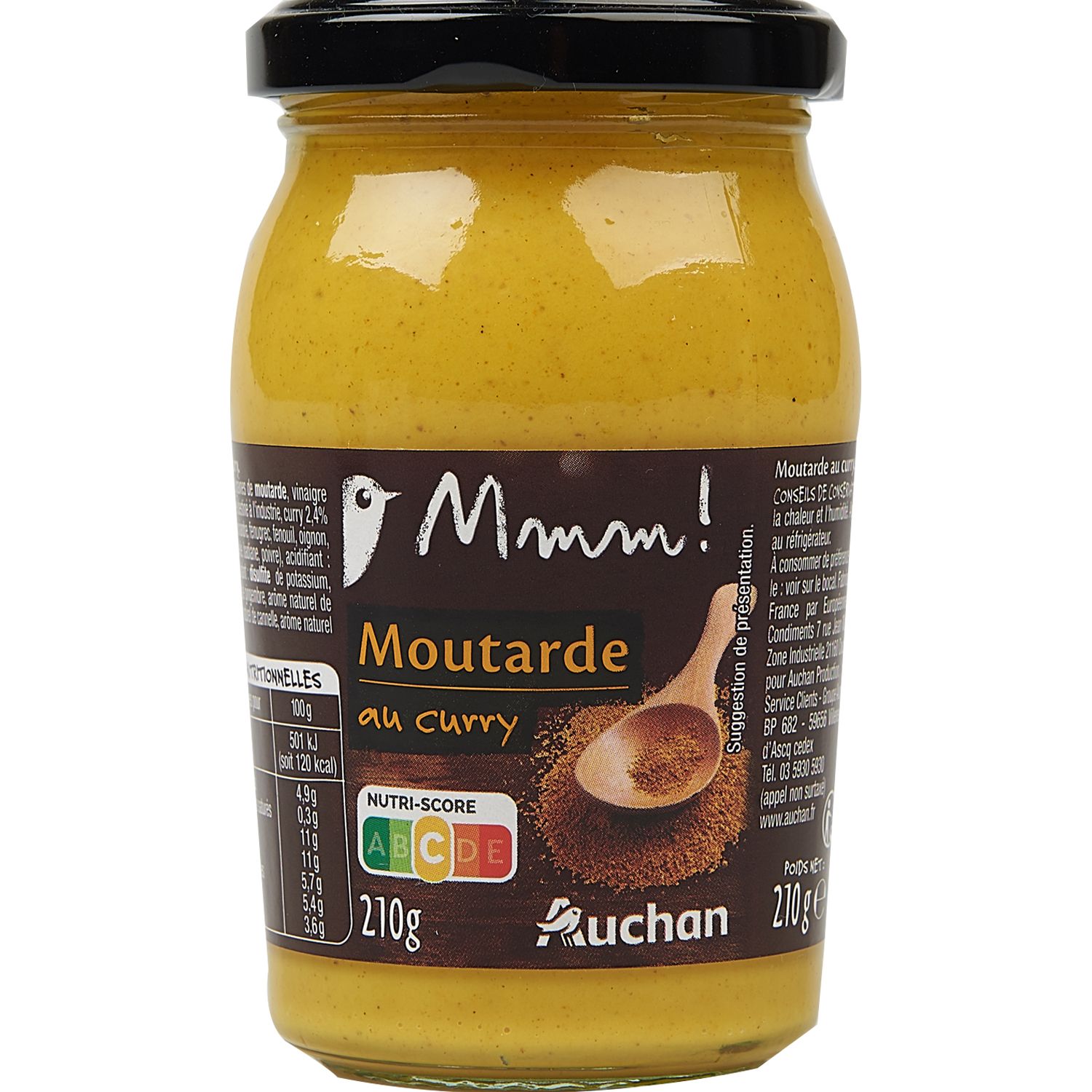 Eau, graines de moutarde , vinaigre d'alcool, sucre, sel, miel destiné à l'industrie, curry 2.4% (curcuma, moutarde , coriandre, fenugrec, fenouil, oignon, gingembre, sel, cannelle, badiane, poivre), acidifiant: acide citrique, antioxydant: disulfite de potassium, épice, arôme naturel de gingembre, arôme naturel de clou de girofle, arôme naturel de cannelle, arôme naturel de muscade.