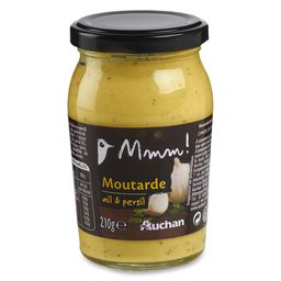 Ingrédients : Eau, graines de MOUTARDE, vinaigre d'alcool 14.50 %, ail 10%, sel, persil 2%, acidifiant : acide citrique, sucre, antioxydant : DISULFITE de potassium, curcuma, arômes.