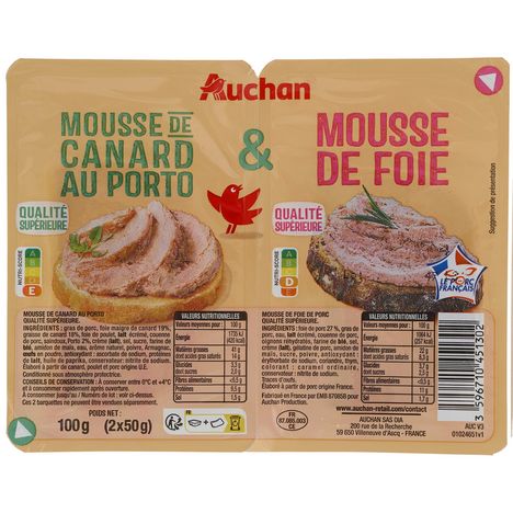 Ingrédients : Mousse de Foie : Foiede porc 27 %, gras de porc, eau, lait écrémé, couenne de porc, oignons réhydratés, farine de blé, sel, crème (lait), gélatine de porc, amidon de maïs, sucre, poivre, antioxydant : érythorbate de sodium coriandre, thym, colorant : caramel ordinaire conservateur : nitrite de sodium. Traces d’œufs. Elaboréà partir de porc origine France.Mousse de Canard : Gras de porc, foie maigre de canard 19%, graisse de canard 18%, foie de poulet, lait écrémé, couenne de porc, saindoux, Porto 2%, crème (lait), sel, sucre, farine de blé, amidon de maïs, eau, arôme naturel, poivre, Armagnac, oeufs en poudre, antioxydant: ascorbate de sodium protéines de lait, huile de paprika, conservateur: nitrite de sodium. Élaboré à partir de canard, poulet et porc d'origine U.E.