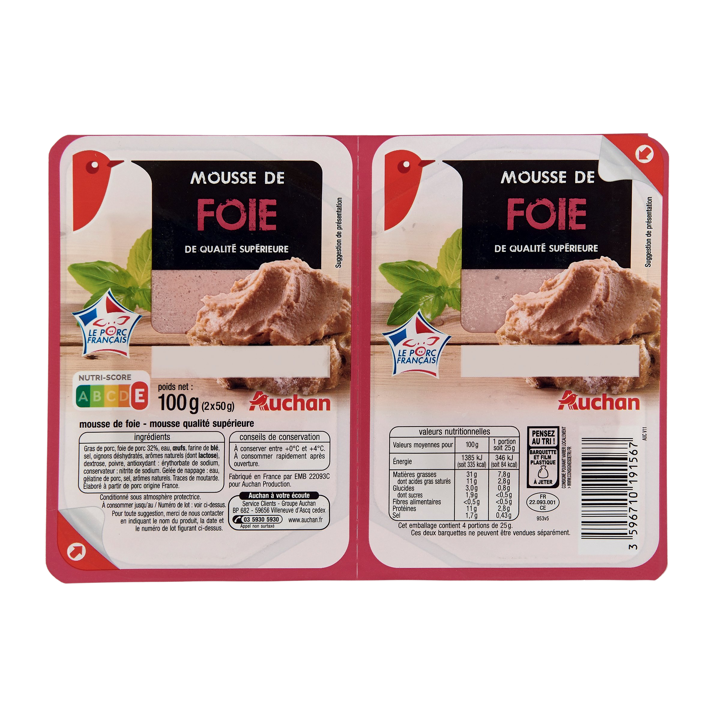 Ingrédients : Gras de porc, foie de porc 32%, eau, OEUFS, farine de BLÉ, sel, oignons déshydratés, arômes naturels (dont LACTOSE), dextrose, poivre, antioxydant : érythorbate de sodium, conservateur : nitrite de sodium. Gelée de nappage : eau, gélatine de porc, sel, arômes naturels. Traces de moutarde. Elaboré à partir de porc origine France.