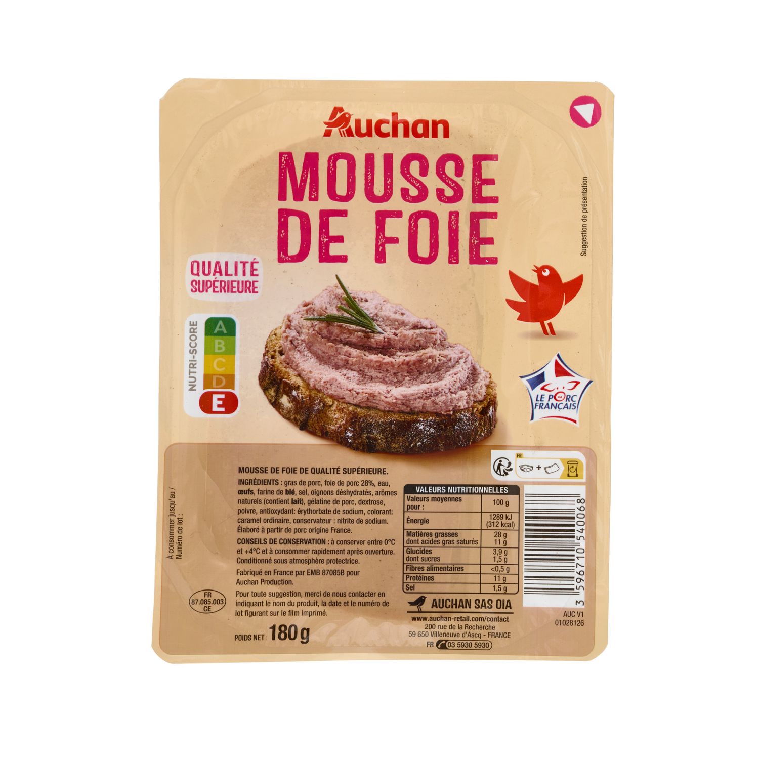 Ingrédients : Gras de porc, foie de porc 28%, eau, oeufs, farine de blé, sel, oignons déshydratés, arômes naturels (contient lait), gélatine de porc, dextrose, poivre, antioxydant: érythorbate de sodium, colorant: caramel ordinaire, conservateur: nitrite de sodium. Élaboré à partir de porc origine France