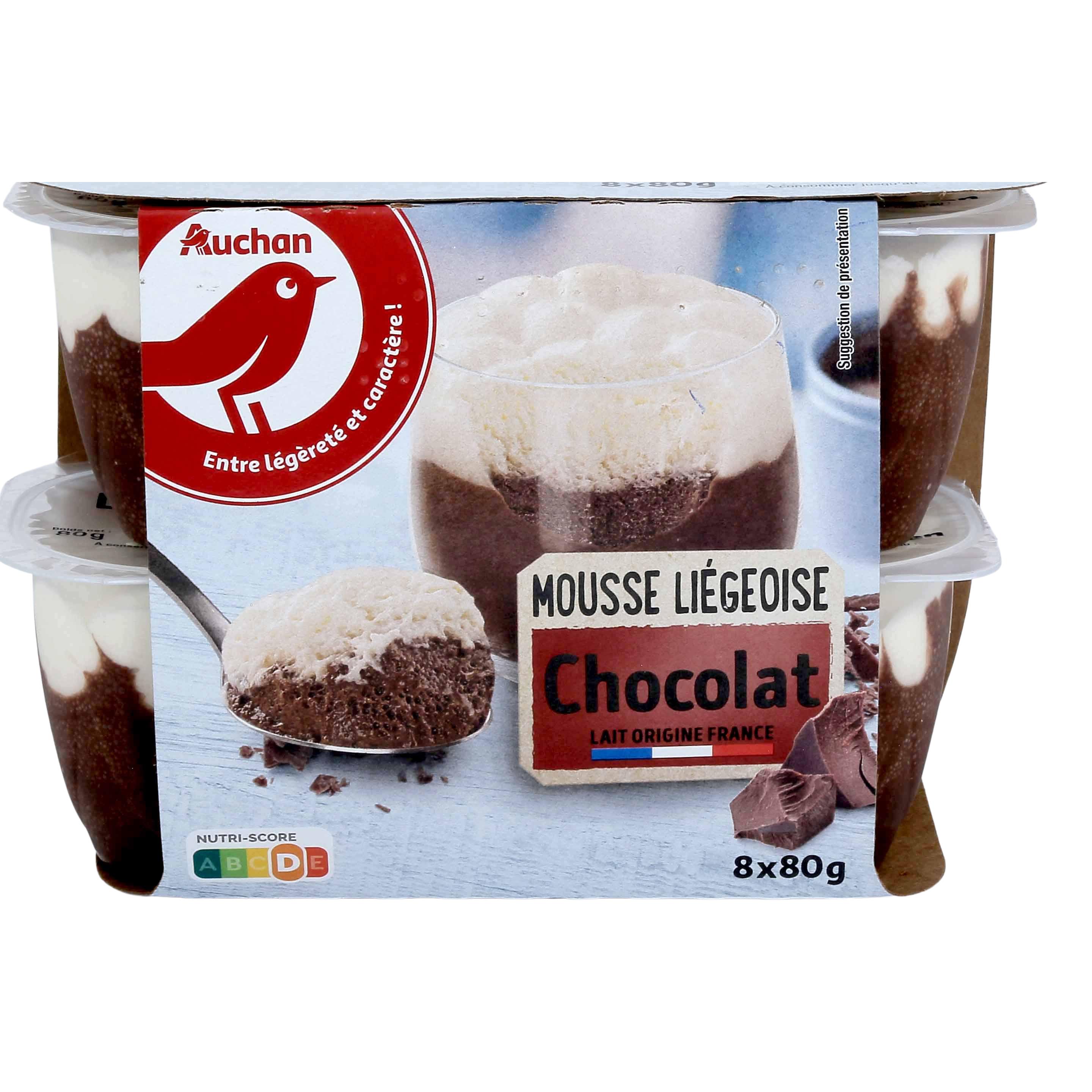 Ingrédients : LAIT entier 59%, crème 17% (LAIT), sucre, chocolat noir (contient LAIt) 4.2% (pâte de cacao*, sucre, cacao maigre en poudre* émulsifiant : lécithines de colza et/ou de tournesol), cacao maigre en poudre* 2.5%, gélatine bovine, amidon modifié, émulsifiant : esters lactiques des mono- et diglycérides d'acides gras épaississants : carraghénanes, gomme guar sel, arôme naturel de vanille, protéines de LAIT, lactose (LAIT) et minéraux du LAIT. Elaboré à partir de lait origine France. *Certifié Rainforest Alliance. Pour en savoir plus : www.rainforest-alliance.org. En achetant du cacao certifié Rainforest Alliance, AUCHAN soutient la culture responsable de cacao.