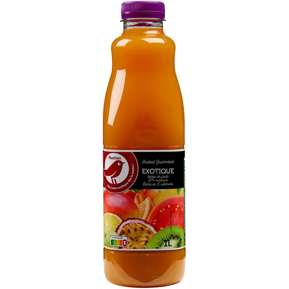 Ingrédients : Jus et purées de fruits partiellement à base de concentrés 50% (pomme, orange, mangue, banane, citron, raisin, fruit de la passion, abricot, goyave, kiwi), eau, sucre, vitamines : C, niacine (B3), E, acide pantothénique (B5), B6, riboflavine (B2), thiamine (B1), acide folique (B9), biotine (B8), pro-vitamine A.