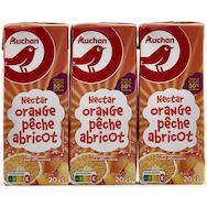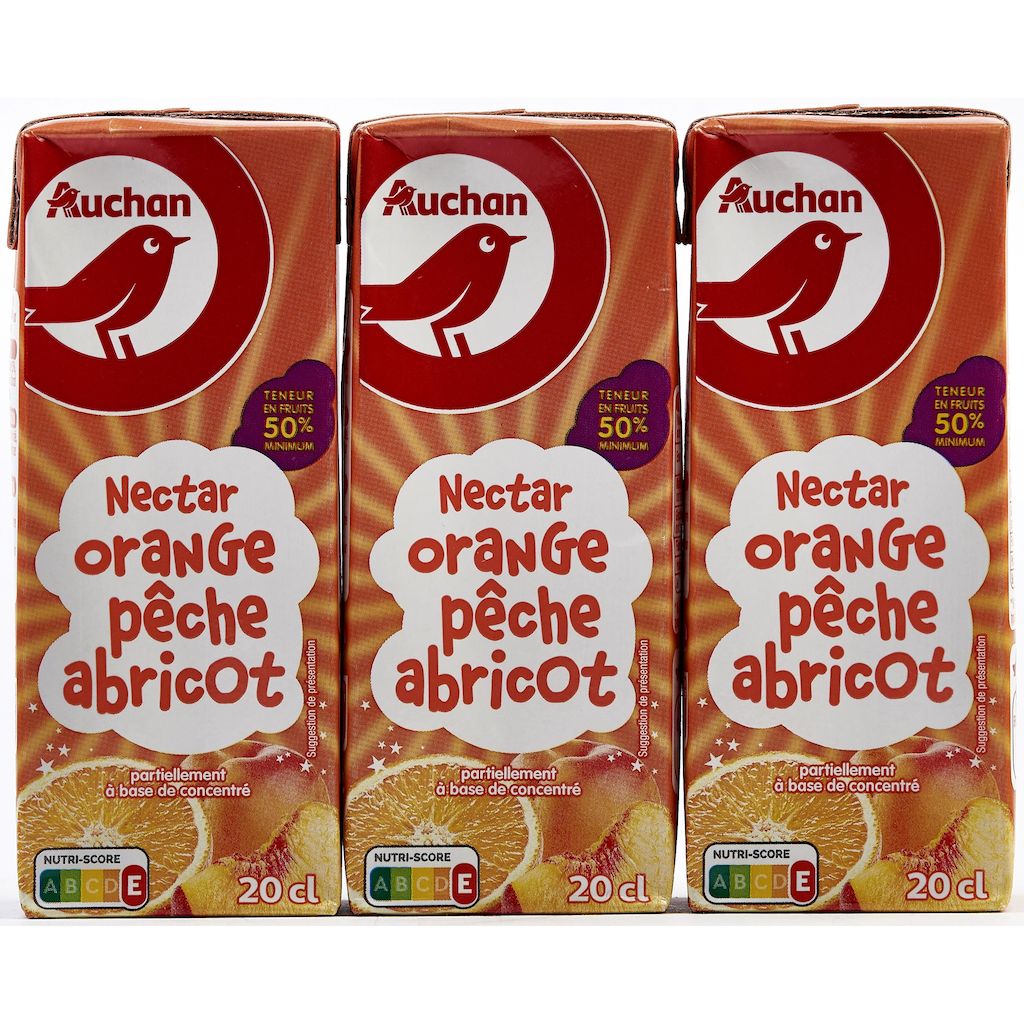 Nectar d'orange, de pêche et d'abricot partiellement à base de concentré. Teneur en fruits : 50% minimum.