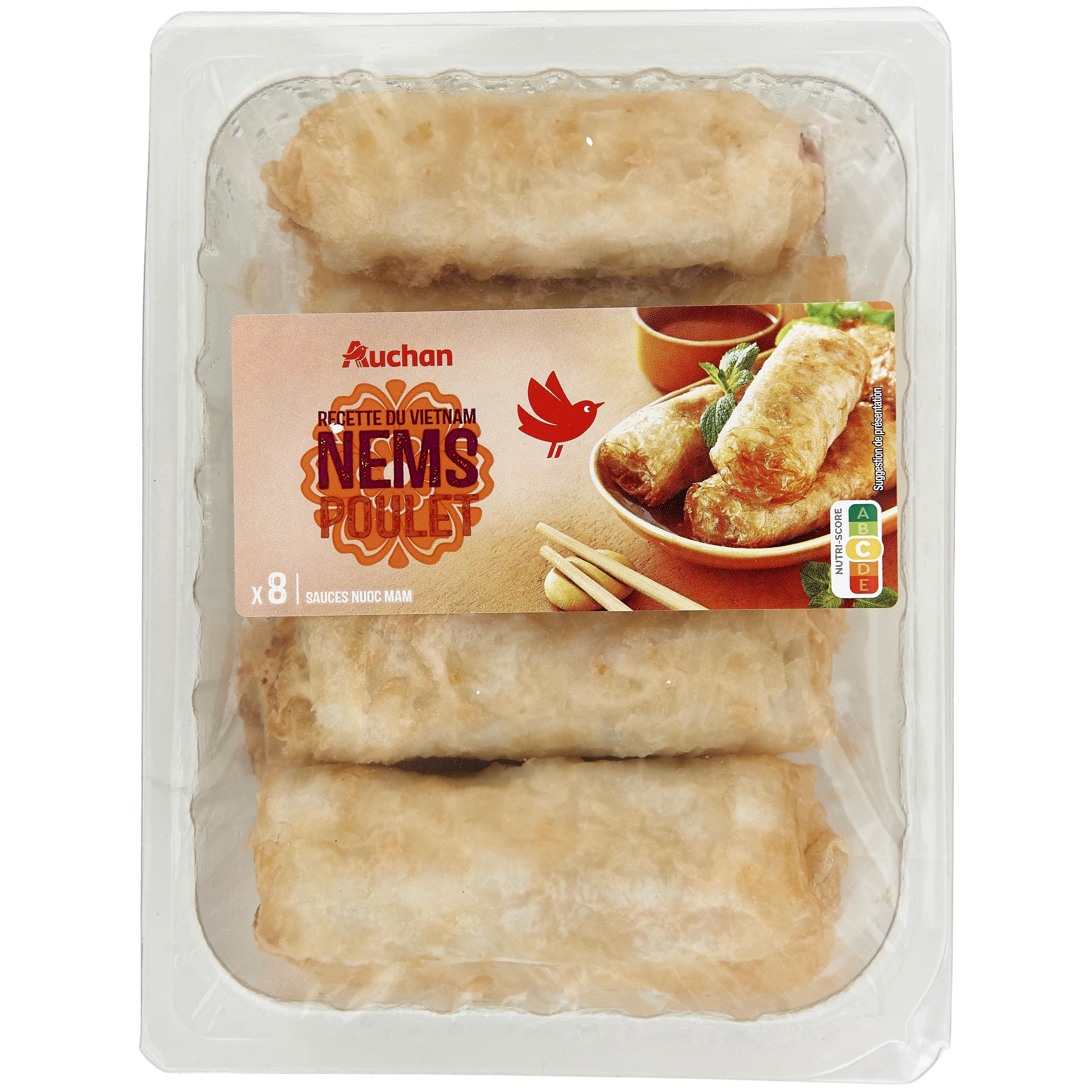 Ingrédients : Nems (89,7%) : Farce 57,3% : vermicelles de pois réhydratés, oignon, viande de poulet 11,5% (origine UE), carotte, proteine de SOJA réhydratée, germes de haricot mungo, champignon noir réhydraté, fécule de manioc, sel, menthe 0,3%, poivre blanc. Galette 32,4% : eau, farine de riz, huile de tournesol, sel. Sauce nuoc mam 10,3% : eau, sucre, nuoc mam (POISSON, sel, eau) 1,4%, vinaigre d'alcool, sel. Pourcentages exprimés sur le total de la recette. Traces éventuelles de blé, crustacés, mollusque, lait, œuf, moutarde, céleri, sésame.
