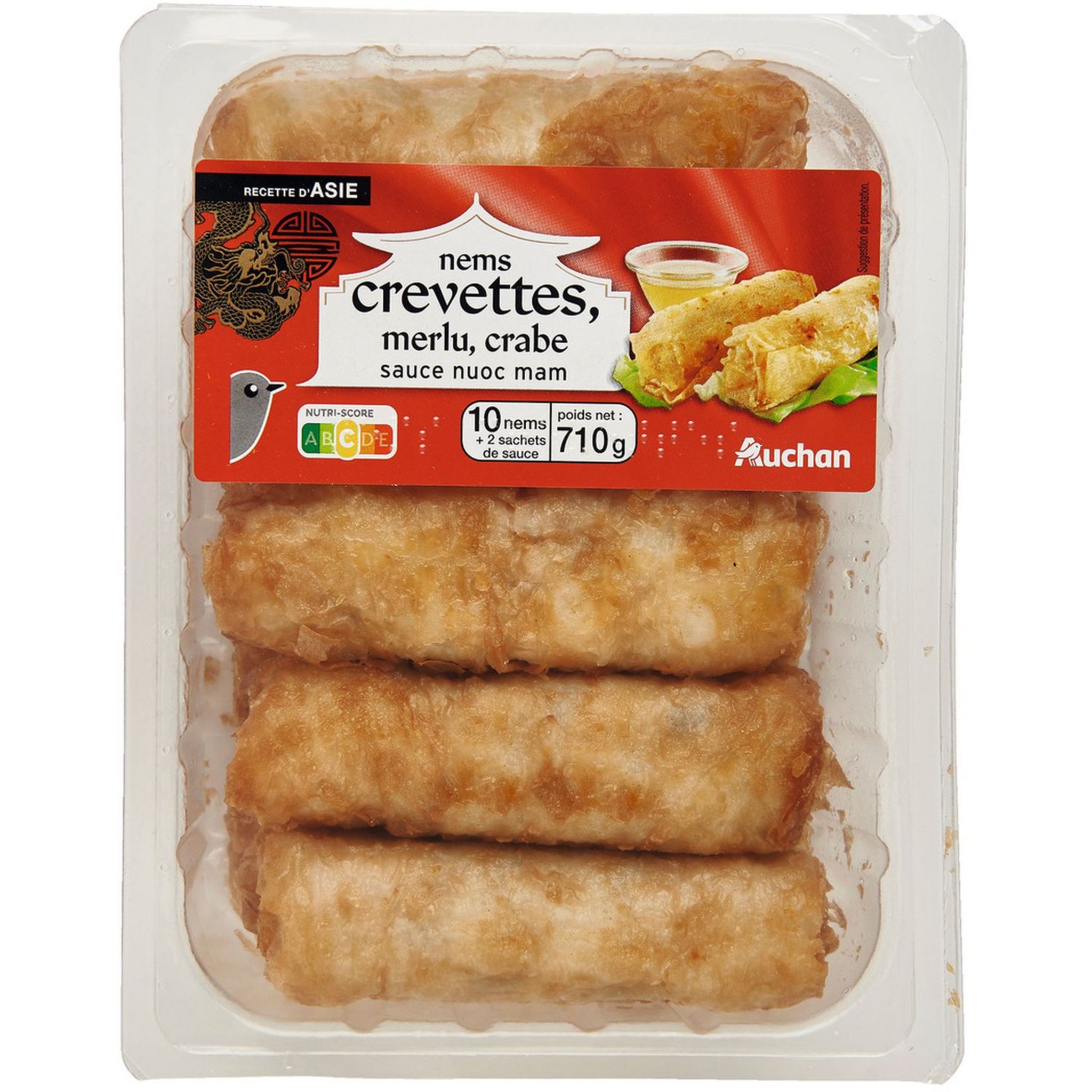 Ingrédients : Ingrédients : Nems (91,5%) : Farce 58,5% : vermicelles de pois réhydratés, carotte, oignon, crevettes (CRUSTACÉS) 7,9% (crevettes (CRUSTACÉS) 7,8%, sel, conservateur : DISULFITE de sodium), protéines de SOJA réhydratée, merlu (POISSON) 5%, farine de SOJA texturée, champignon noir réhydraté, coriandre, amidon de riz, sel, sauce au POISSON (POISSON, sel, eau), sucre. Galette 33% : eau, farine de riz, huile de tournesol, sel. Sauce nuoc mam (8,5%) : eau, sucre, vinaigre d'alcool, sel, nuoc mam (contient POISSON) 0,14% (poisson, sel, eau), sauce SOJA (eau, graines de SOJA, sel, farine de blé (contient GLUTEN)). Pourcentages exprimés sur le total de la recette. Traces éventuelles de mollusques, lait, œuf, moutarde, céleri et sésame.