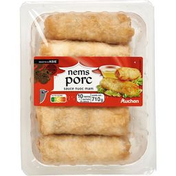 Ingrédients : Nems (91,5%) : Farce 58,5% : viande de porc 15% (origine France), vermicelles de pois réhydratés, oignons, carotte, protéines et amidon de blé (contient GLUTEN), germes de haricot mungo, gras de porc 2,5%, champignon noir réhydraté, oignons déshydratés, arômes (contient GLUTEN), sel, poivre. Galette 33% : eau, farine de riz, huile de tournesol, sel. Sauce nuoc mam 8,5% : eau, sucre, vinaigre d'alcool, sel, nuoc mam (contient POISSON) 0,14% (POISSON, sel, eau), sauce SOJA (eau, graines de SOJA, sel, farine de blé (contient GLUTEN)). Pourcentages exprimés sur le total de la recette. Traces éventuelles de crustacés, lait, oeuf et sésame.