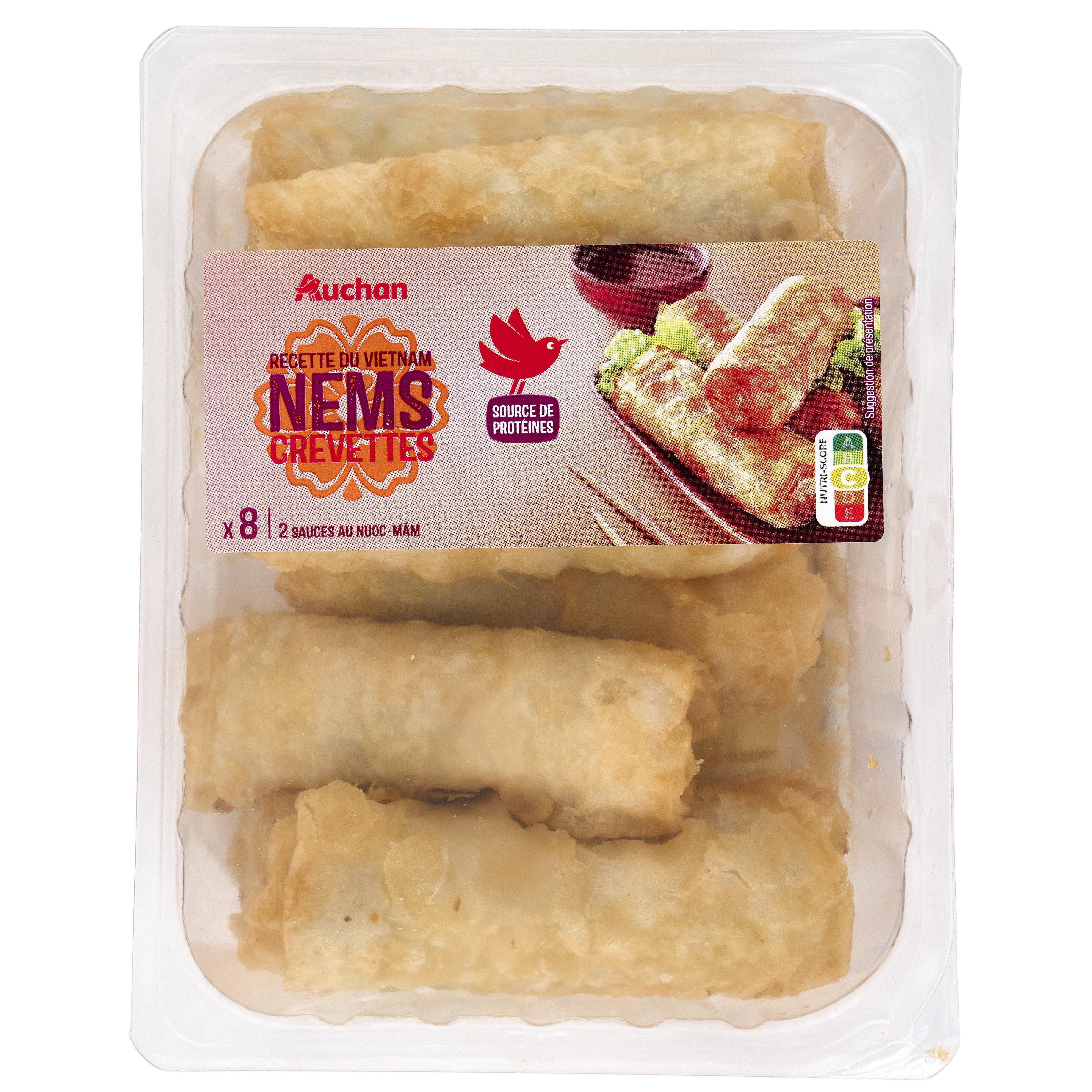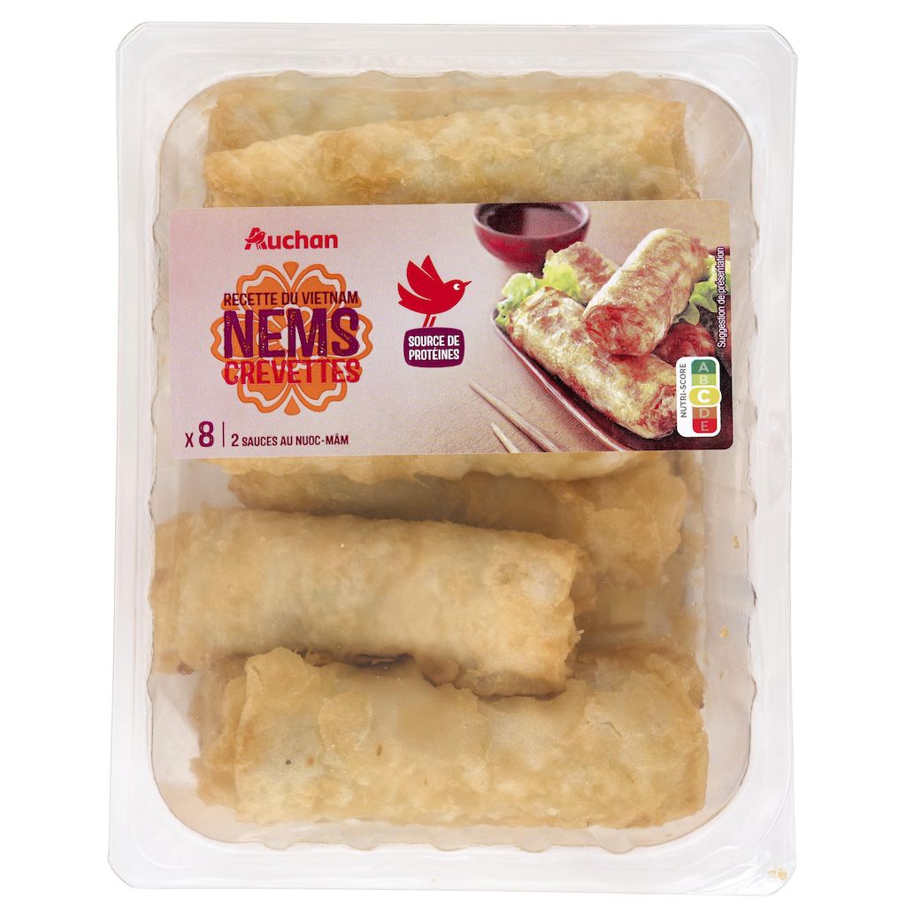 Ingrédients : Ingrédients : Nems crevettes (85,7%) : eau, farine de riz 13,2%, vermicelle de pois réhydraté, oignons, crevettes décortiquées 8,7% [crevettes (crustacés) sel, conservateur : disulfite de sodium], carottes, protéine de soja texturée réhydratée, champignon noir réhydraté, protéines de soja texturées, farine de perles de tapioca, coriandre, purée d'ail, sel, sauce poisson (poisson, sel, eau). Friture : huile de tournesol.Sauce au nuoc-mâm (14,3%) : eau, sucre, vinaigre d'alcool, sel, sauce poisson 0,2% (poisson, sel, eau), sauce soja (eau, graine de soja, sel, farine de blé). Pourcentages exprimés sur le total de la recette. Traces éventuelles de mollusques, lait, œufs, moutarde, céleri et graines de sésame.