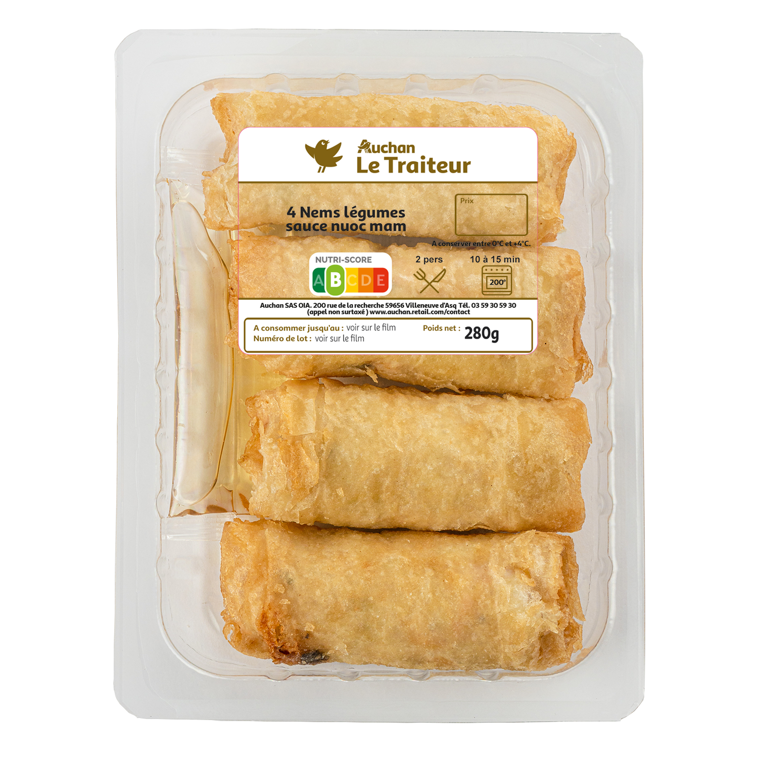 Au four : préchauffer le four 10 minutes à 200°C (th 7/8) et réchauffer les nems 10 à 15 minutes.