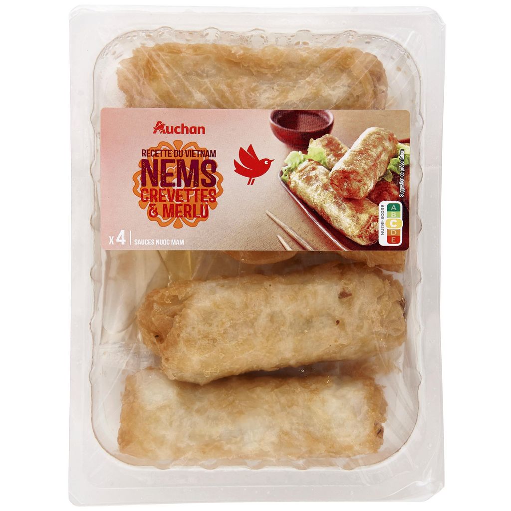 Ingrédients : Ingrédients: Nems (86,7%) : Farce 55,4% : vermicelles de pois réhydratés, carotte, oignon, crevettes (crustacés) 7,5% (crevettes (crustacés) 7,4%, sel, conservateur : disulfite de sodium), protéines de soja réhydratée, merlu (poisson) 4,7%, farine de soja texturée, champignon noir réhydraté, coriandre, amidon de riz, sel, sauce au poisson (poisson, sel, eau), sucre. Galette 31,3% : eau, farine de riz, huile de tournesol, sel. Sauce nuoc mam (13,3%) : eau, sucre, nuoc mam (poisson) 1,9% (poisson, sel, eau), vinaigre d'alcool, sel. Pourcentages exprimés sur le total de la recette. Traces éventuelles de blé, mollusques, lait, œuf, moutarde, céleri et sésame.
