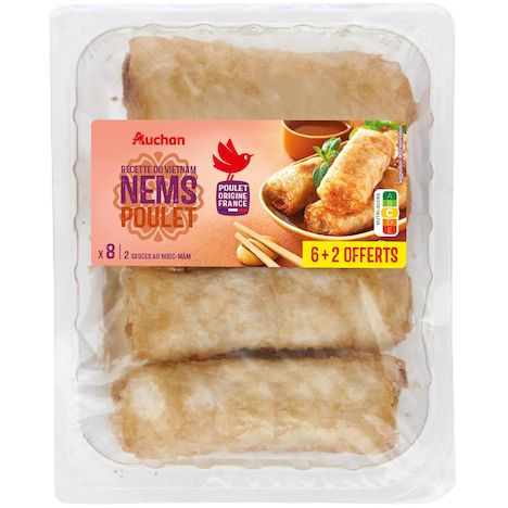 Ingrédients : Nems poulet (85,7%) : eau, farine de riz 13,2%, vermicelle de pois réhydraté, oignons, viande de poulet 10,2% (origine : France), carottes, protéine de soja texturée réhydratée, germes de haricot mungo, champignon noir réhydraté, farine de perles de tapioca, sel, menthe douce 0,3%, poivre blanc. Friture : Huile de tournesol.Sauce au nuoc-mâm (14,3%) : eau, sucre, vinaigre d'alcool, sel, sauce poisson 0,2% (poisson, sel, eau), sauce soja (eau, graine de soja, sel, farine de blé).Pourcentages exprimés sur le total de la recette. Traces éventuelles de crustacés, mollusques, lait, œufs, moutarde, céleri et graines de sésame.