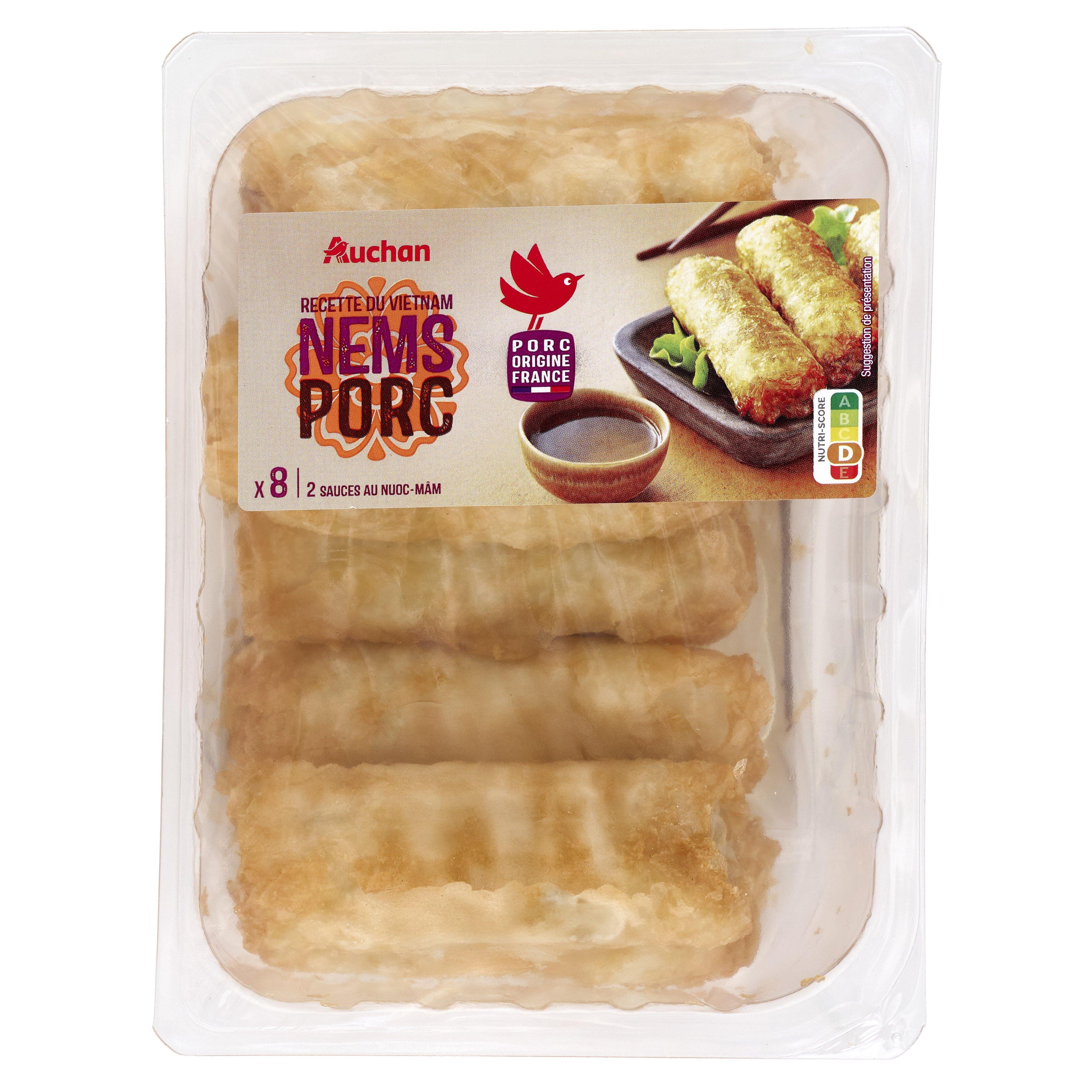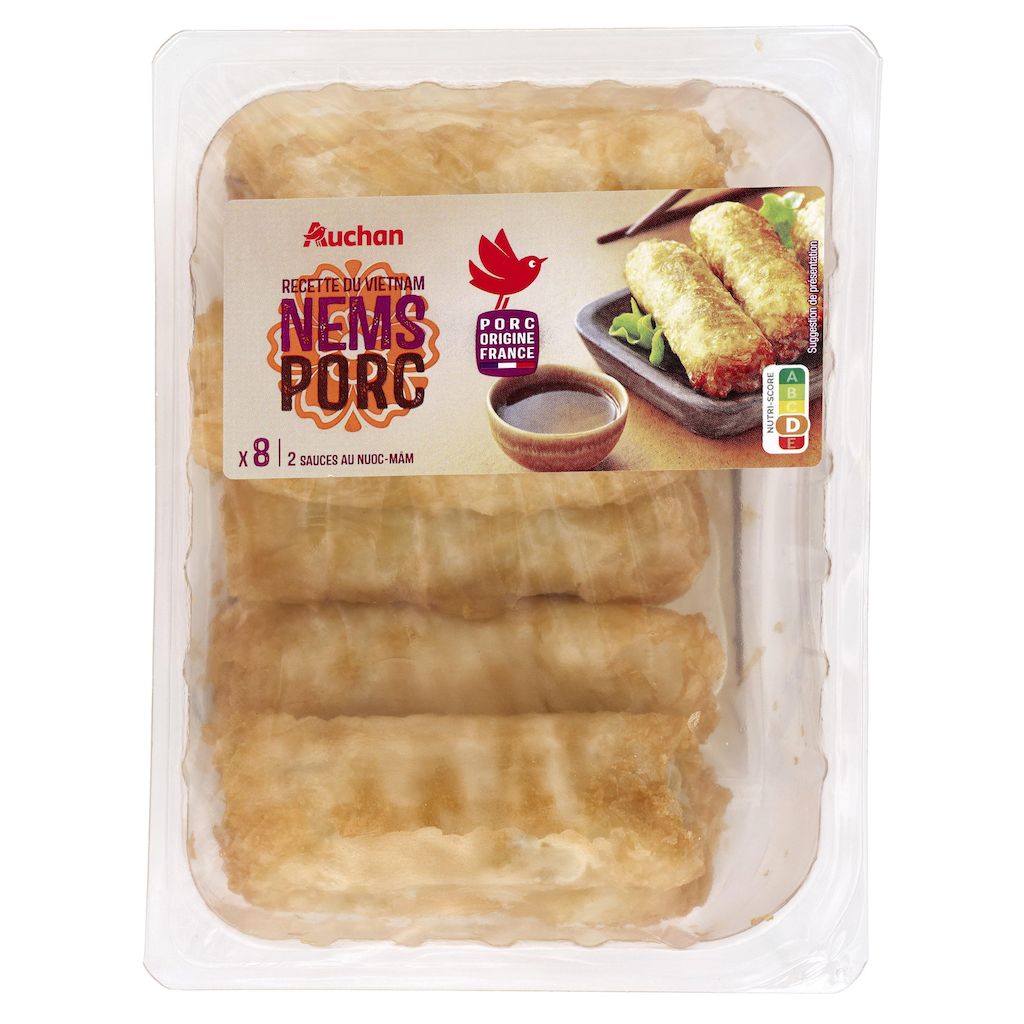 Ingrédients : Ingrédients : Nems porc (85,7%) : eau, farine de riz 13,2%, vermicelle de pois réhydraté, oignon, carottes, viande de porc 7,9% (origine : France), protéine de soja réhydratée, gras de porc 1,3%, sel, fibre de bambou, protéines de soja, vinaigre de malt en poudre, maltodextrine de blé, épices (ail déshydraté, gingembre, cannelle, poivre noir, piment, curcuma), plantes aromatiques (coriandre, oignon en poudre), arômes, champignon noir réhydraté. Friture : Huile de tournesol.Sauce au nuoc-mâm (14,3%) : eau, sucre, vinaigre d'alcool, sel, sauce poisson 0,2% (poisson, sel, eau), sauce soja (eau, graine de soja, sel, farine de blé).Pourcentages exprimés sur le total de la recette. Traces éventuelles de crustacés, mollusques, lait, œufs, moutarde, céleri et graines de sésame.