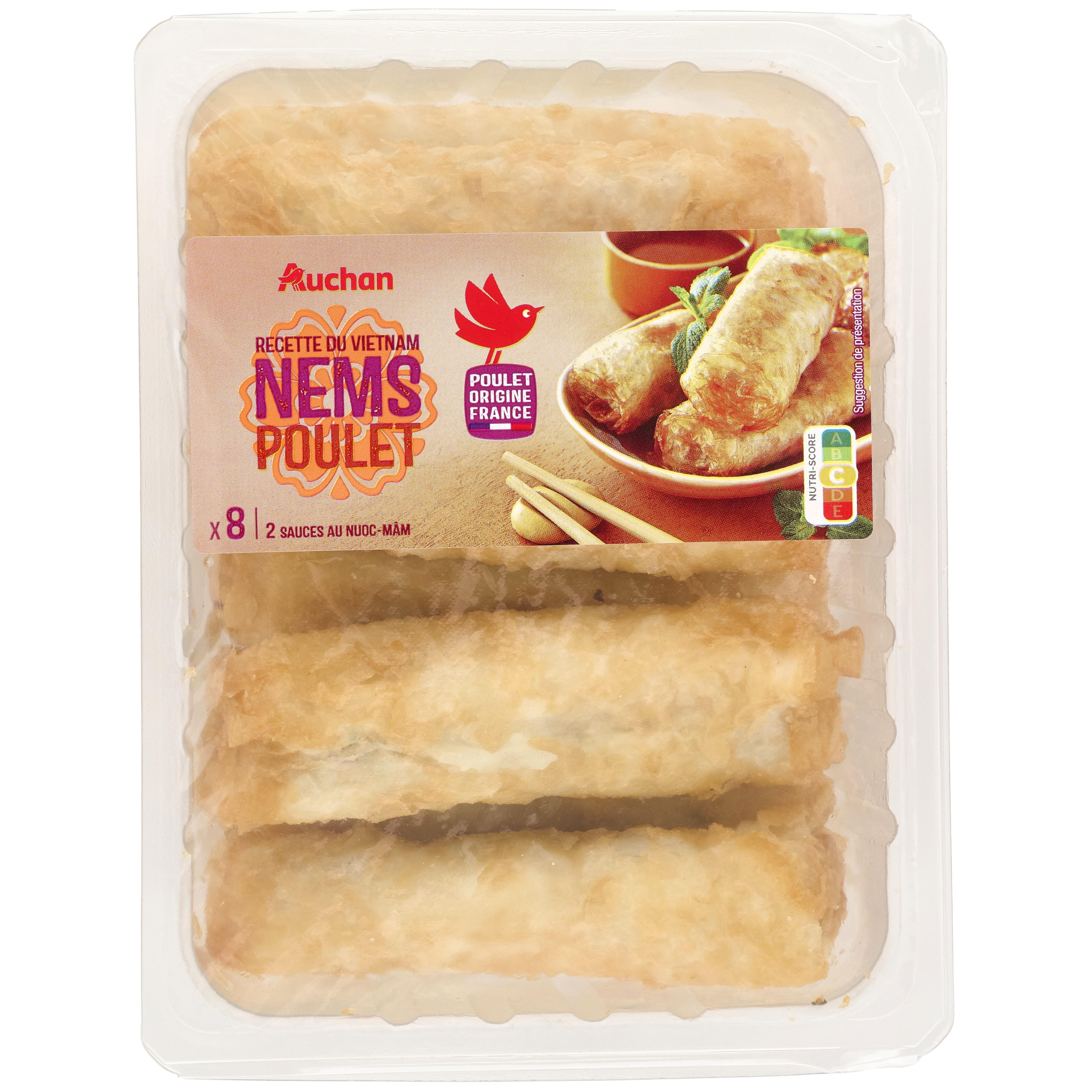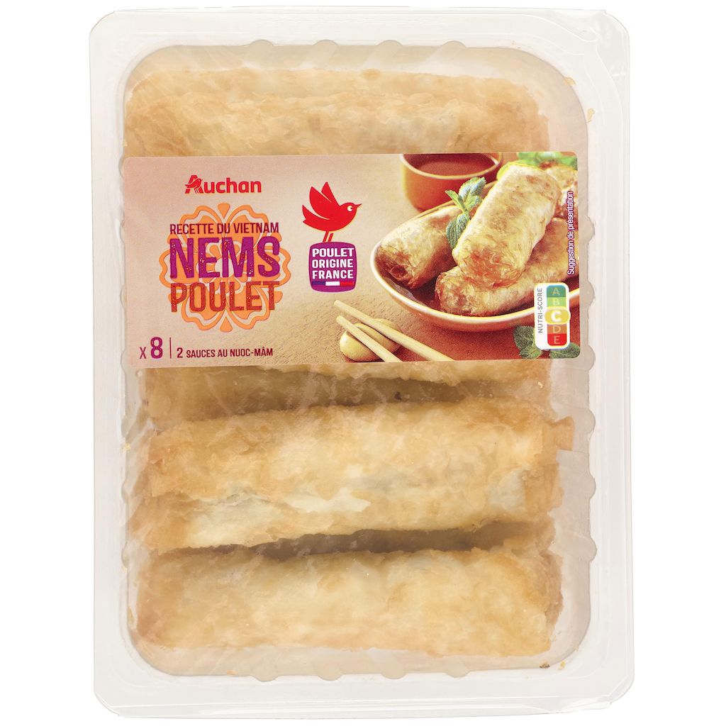 Ingrédients : Nems poulet (85,7%) : eau, farine de riz 13,2%, vermicelle de pois réhydraté, oignons, viande de poulet 10,2% (origine : France), carottes, protéine de soja texturée réhydratée, germes de haricot mungo, champignon noir réhydraté, farine de perles de tapioca, sel, menthe douce 0,3%, poivre blanc. Friture : Huile de tournesol.Sauce au nuoc-mâm (14,3%) : eau, sucre, vinaigre d'alcool, sel, sauce poisson 0,2% (poisson, sel, eau), sauce soja (eau, graine de soja, sel, farine de blé).Pourcentages exprimés sur le total de la recette. Traces éventuelles de crustacés, mollusques, lait, œufs, moutarde, céleri et graines de sésame.