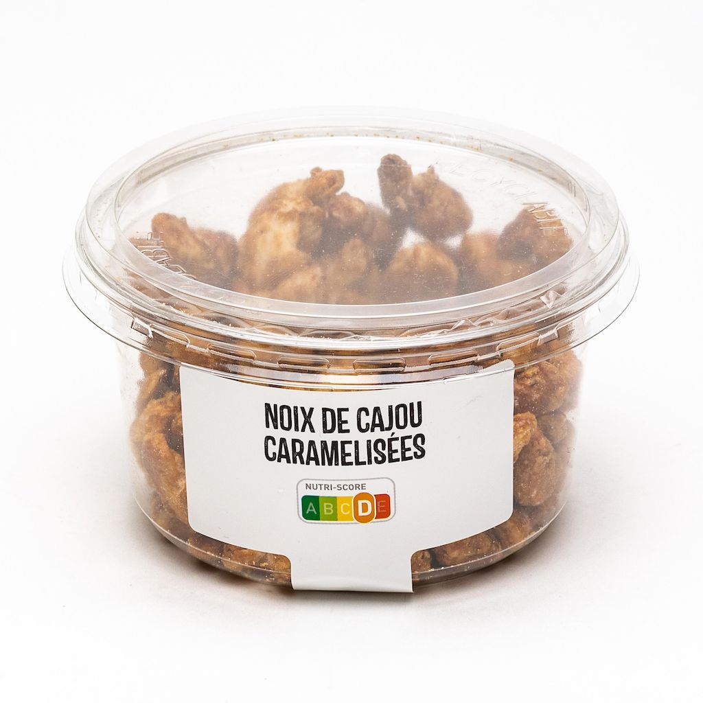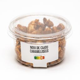 NOIX DE CAJOU 61,9%, sucre. Traces éventuelles d’ARACHIDES, d'AUTRES FRUITS A COQUE, SOJA, LAIT et SULFITES.