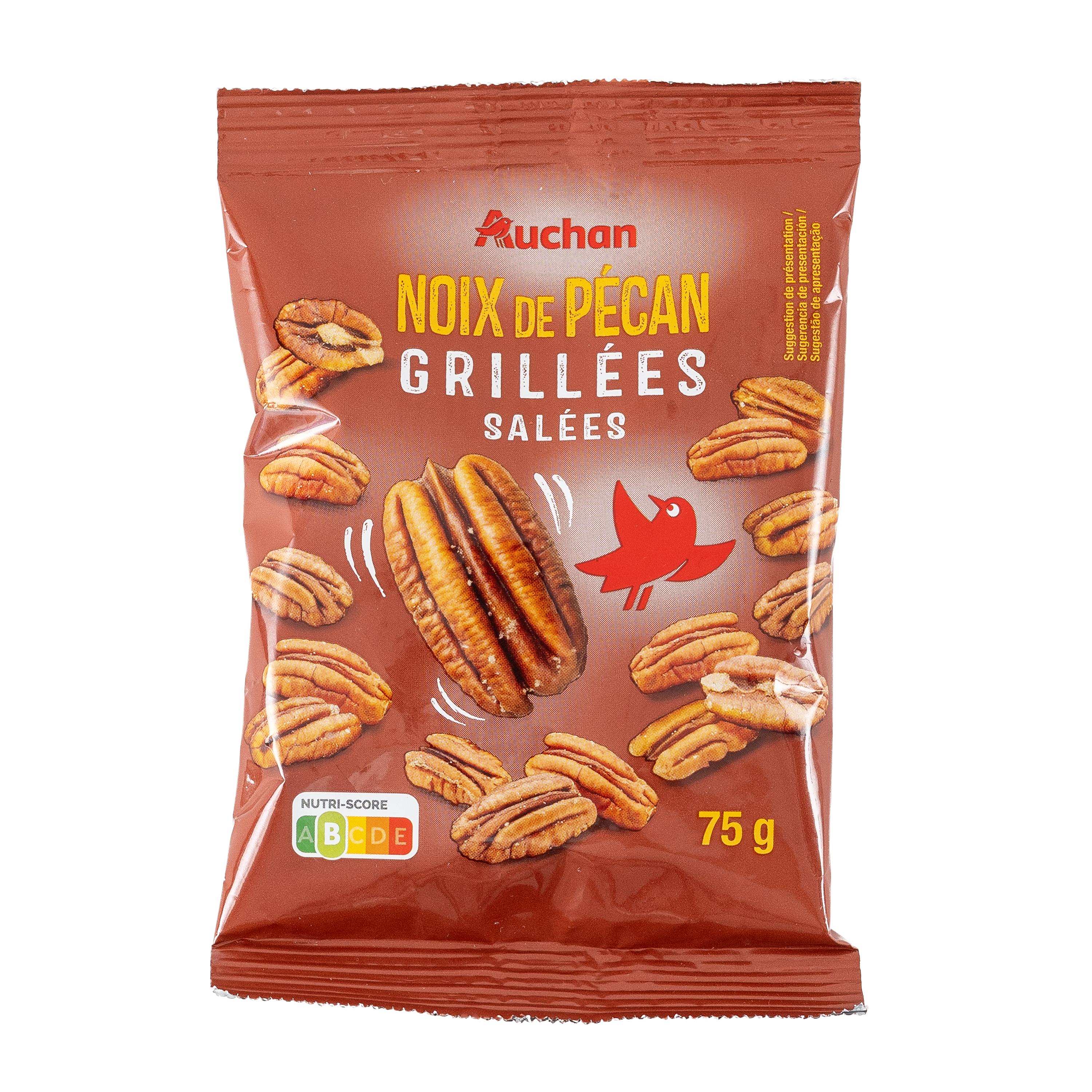 Noix de pécan 97.5%, huile de tournesol, sel 1%. Traces éventuelles d'arachides et autres fruits à coque.
