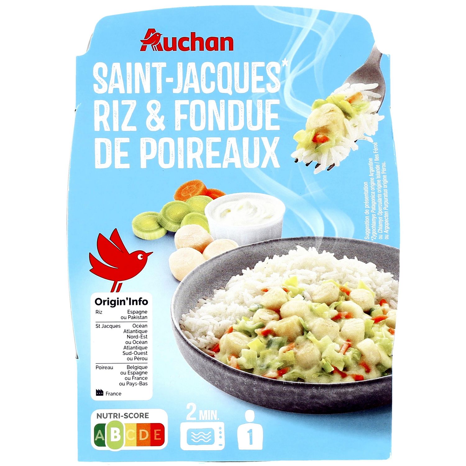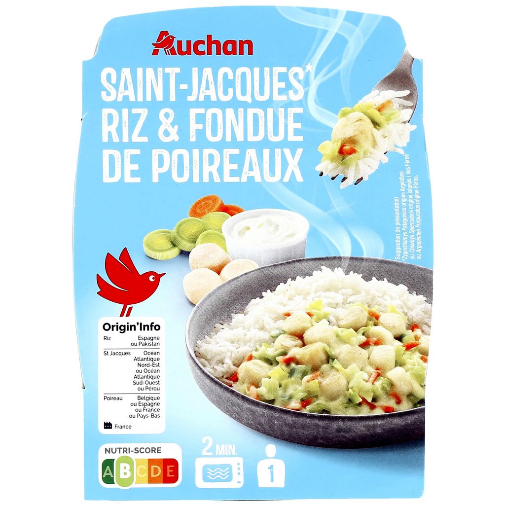 Ingrédients : Riz 41.8% (eau, riz long), noix de Saint-Jacques 21.4% (* Zygochlamys Patagonica origine Argentine ou Chlamys Opercularis origine Islande / Iles Féroé ou Argopecten Purpuratus origine Pérou) (MOLLUSQUES), eau, poireaux 7.2%, crème fraîche (LAIT), crème de riz (eau, riz), carottes 2.7%, huile de colza, beurre (LAIT) , amidon de riz, vermouth Noilly prat® 0.7% (contient LAIT ), vin blanc, sel, échalotes 0.2%, vinaigre de vin blanc, curcuma, piment. *voir l'origine à l'emplacement de la date limite de consommation.