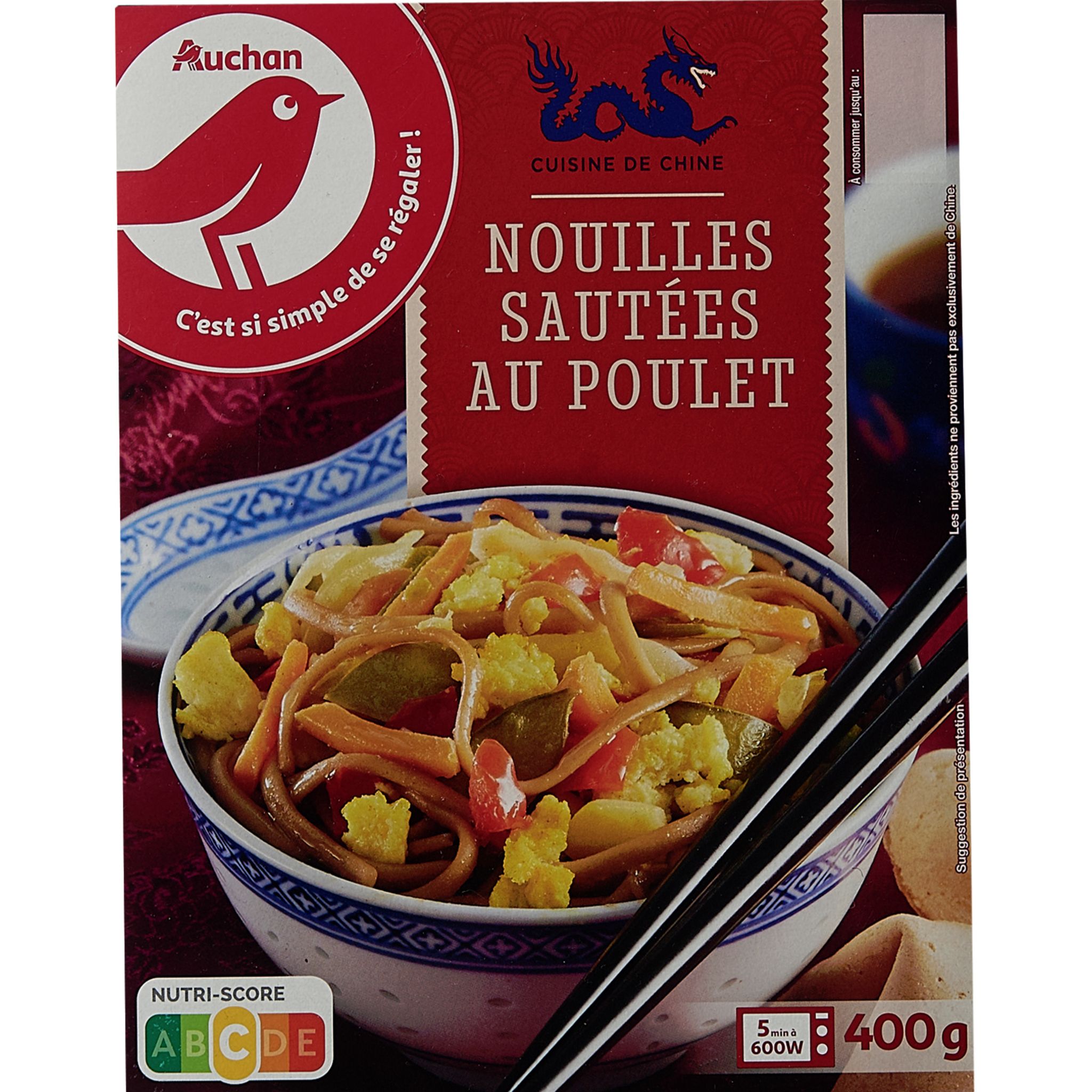 Nouilles cuites 47,1% (eau, semoule de blé dur, farine de blé tendre, sel, huile de soja), choux blancs 12%, filet de poulet 8,5%, oeufs 8,1%, pois mange tout 5%, oignons 4,5%, carottes 3%, poivrons rouges 3%, huile de soja, sauce soja 2,1% (eau, graines de soja, sel, sucre, farine de blé), sauce poisson (extrait d'anchois (poisson), sel, sucre), sucre, ail, fécule de pommes de terre, huile de tournesol, sel, poivre blanc, extrait de levure, colorant: caroténoïdes, émulsifiant: sucroesters d'acides gras. Traces éventuelles de crustacés, arachides, lait, fruits à coque, céleri, moutarde, graines de sésame et mollusques.Pourcentage exprimés sur le total de la recette.Elaboré à partir de poulet origine UE.