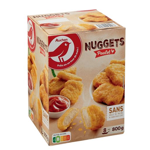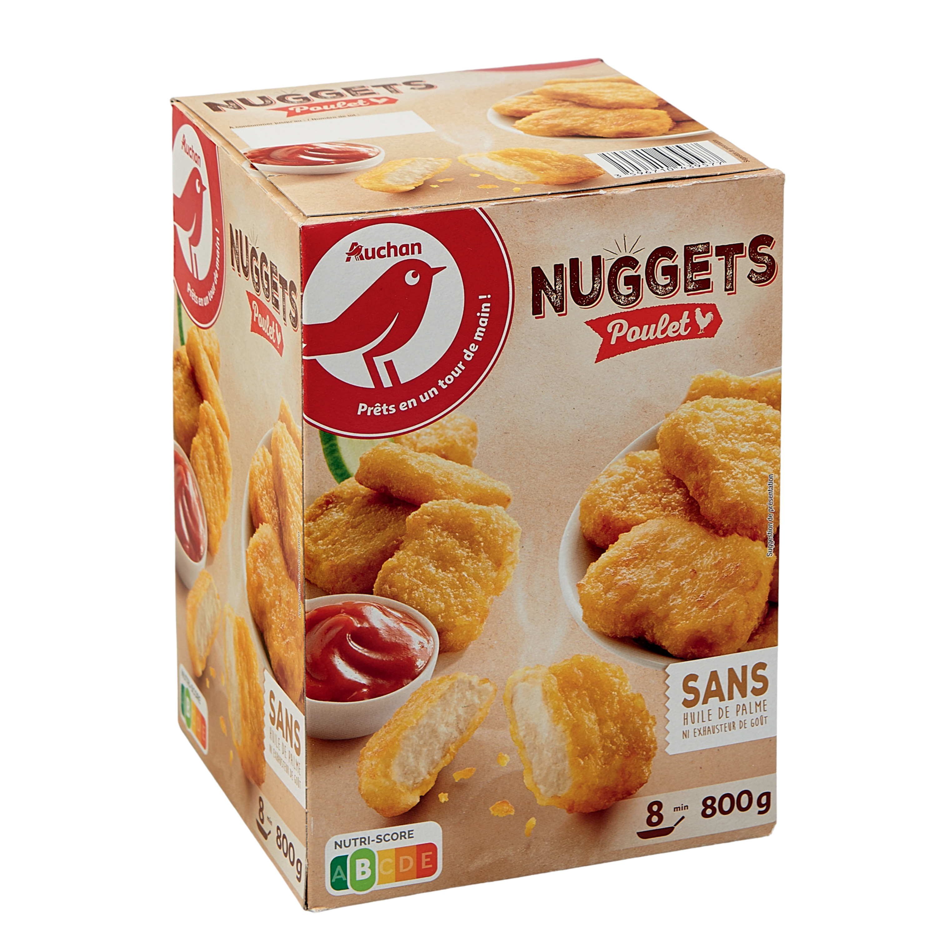 Les nuggets de poulet AUCHAN, à base de viande de poulet traitée en salaison, sont enrobés d'une délicieuse pâte à beignet croustillante. à cuire à la poèle ou au four, les nuggets ravieront les petits comme les grands.