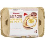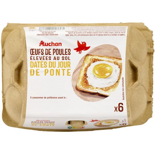 Des oeufs, origine France, de calibre moyen ou gros, vendus par 6, pondus par des poules élevées au sol. La boîte est entièrement recyclable et également compostable à domicile