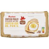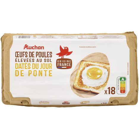Des oeufs, origine France, de calibre moyen ou gros, vendus par 18, pondus par des poules élevées au sol. La boîte est entièrement recyclable et également compostable à domicile