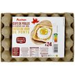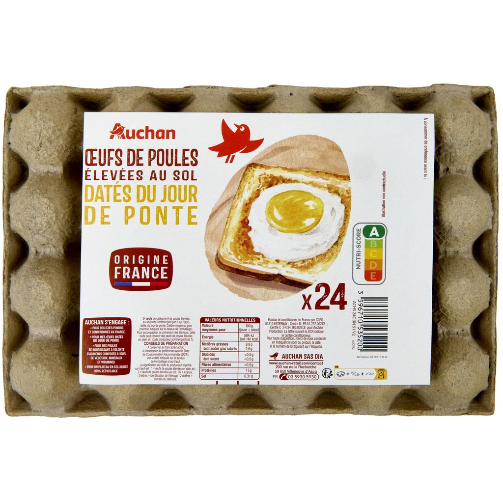 Des oeufs origine FranceDe calibre moyen ou grosPondus par des poules élevées au sol.Datés du Jour de PonteVendus dans un gros conditionnement par 24 sous la marque Auchan