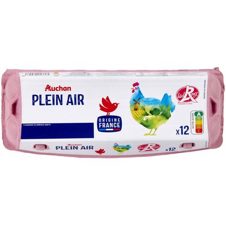 Ingrédients : 12 ŒUFS de catégorie A de poules élevées en plein air Label Rouge (code commençant par 1 sur l'œuf). Calibre moyen ou gros (mention indiquée sur le couvercle de la boite). La signification du code du producteur imprimé sur l'oeuf est : 1 = oeufs de poules élevées en plein air FR = France 3 lettres = identification de l'élevage 2 chiffres = numéro du bâtiment.