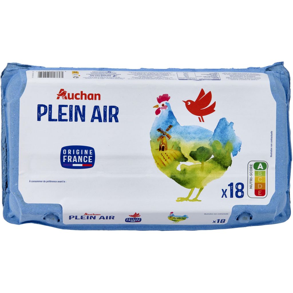 Ingrédients : 18 OEUFS frais, de catégorie A, de poules élevées en plein air (code commençant par 0 ou 1 sur l'oeuf), Calibre Moyen ou Gros (mention indiquée sur l'étiquette).