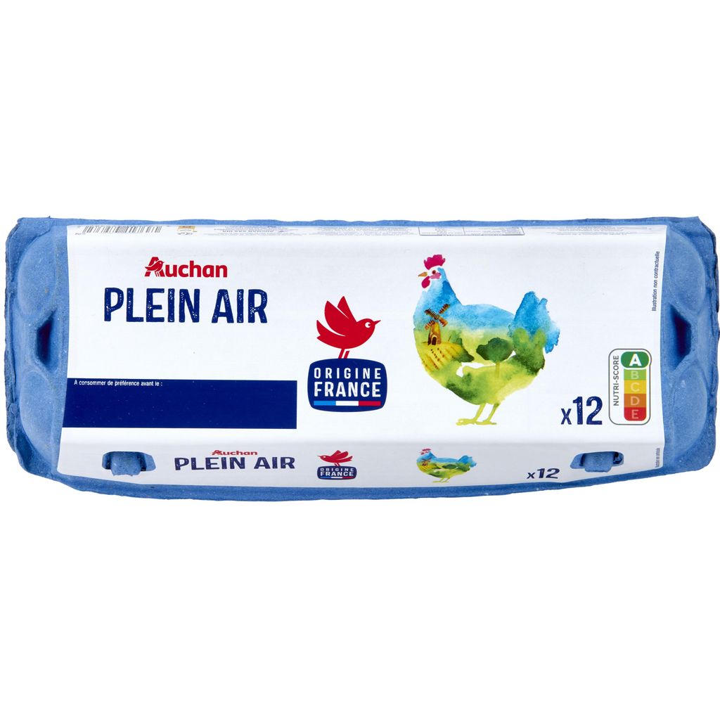 Ingrédients : 12 œufs frais de catégorie A de poules élevées en plein air (code commençant par 0 ou 1 sur l’œuf). Calibre Moyen ou Gros.